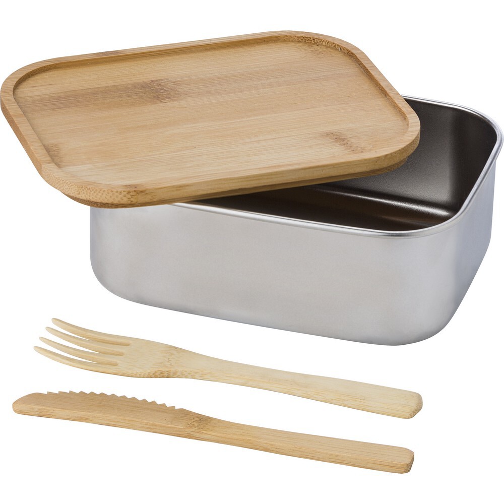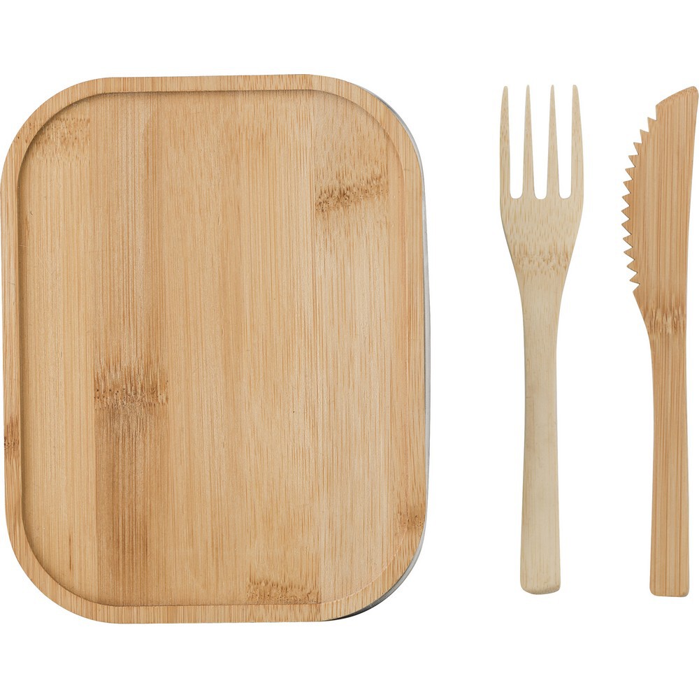 Pudełko śniadaniowe 600 ml z bambusowym wieczkiem i sztućcami (nóż, widelec), połączone paskiem