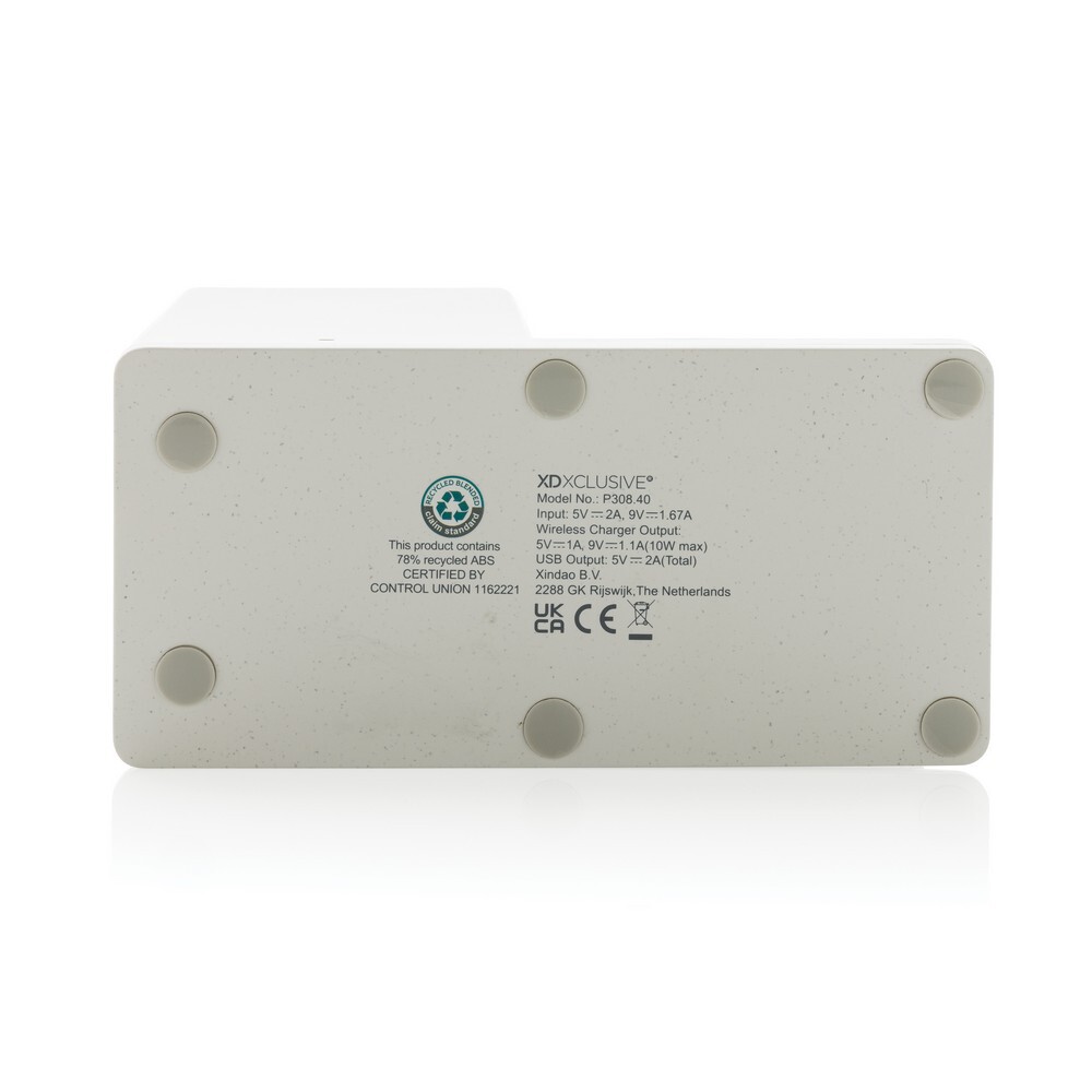 Ładowarka bezprzewodowa 10W, stojak na przybory do pisania, dwa porty USB z tyłu, wykonana z ABS z recyklingu, posiada certyfikat RCS (Recycled Claim Standard), całkowita zawartość materiału z recyklingu obliczona w oparciu o wagę całkowitą przedmiotu: 78%, panel ładowania bezprzewodowego wykonany z bambusa z certyfikatem FSC®, bezprzewodowe ładowanie jest kompatybilne ze wszystkimi urządzeniami posiadającymi możliwość ładowania indukcyjnego, funkcja szybkiego ładowania, wejście USB typu C 5V/2A, 9V/2A, wyjście bezprzewodowe 5V/1A, 9V/1,1A, kabel USB typu C 120 cm wykonany z TPE z recyklingu w komplecie, w pudełku kraftowym z certyfikatem FSC® mix, nie zawiera PVC, zarejestrowany wzór®