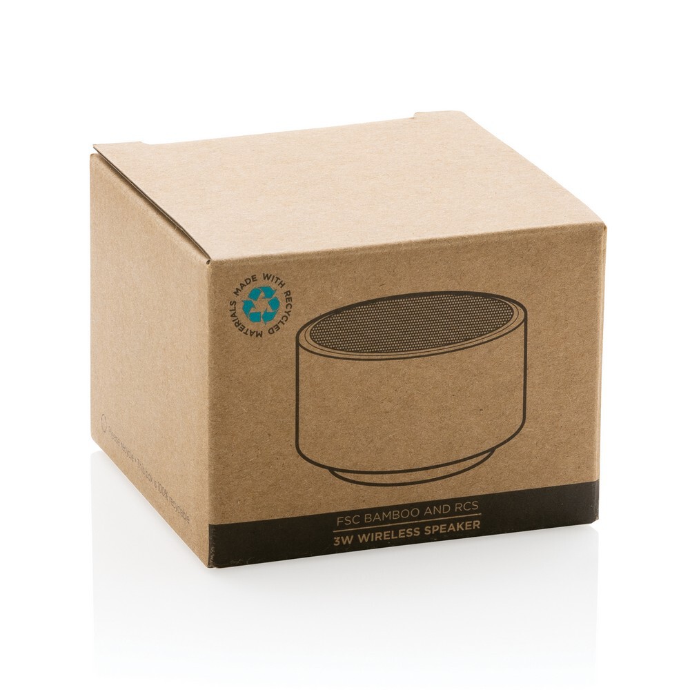 Głośnik bezprzewodowy 3W, BT 4.1 wykonany z bambusa i ABS z recyklingu, zawartość materiałów z recyklingu obliczona na podstawie wagi całkowitej przedmiotu: 16%, litowy akumulator o pojemności 300 mAh umożliwia odtwarzanie muzyki do 3 godzin, zasięg do 10m, z funkcją odbioru i mikrofonem do odbierania połączeń, w pudełku kraftowym z certyfikatem FSC® mix, kabel wykonany z TPE bez dodatku PVC w komplecie