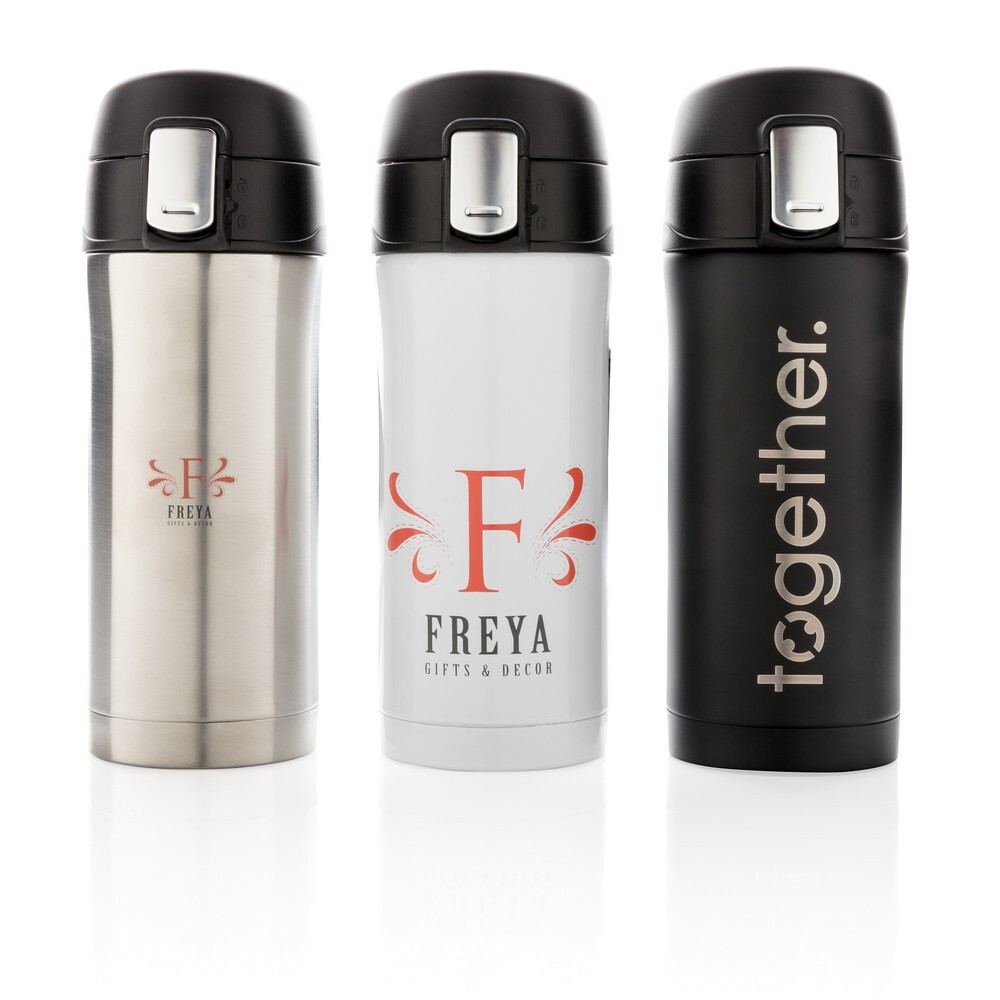 Kubek termiczny 300 ml, podwójne ścianki ze stali nierdzewnej z próżnią pomiędzy, obsługa jedną ręką, utrzymuje temperaturę napojów ciepłych do 5 godzin i do 15 godzin zimnych, wykonany z materiałów pochodzących z recyklingu z certyfikatem RCS, całkowita zawartość materiałów z recyklingu obliczona na podstawie wagi całkowitej przedmiotu: 71%, w pudełku z papieru kraftowego z certyfikatem FSC®