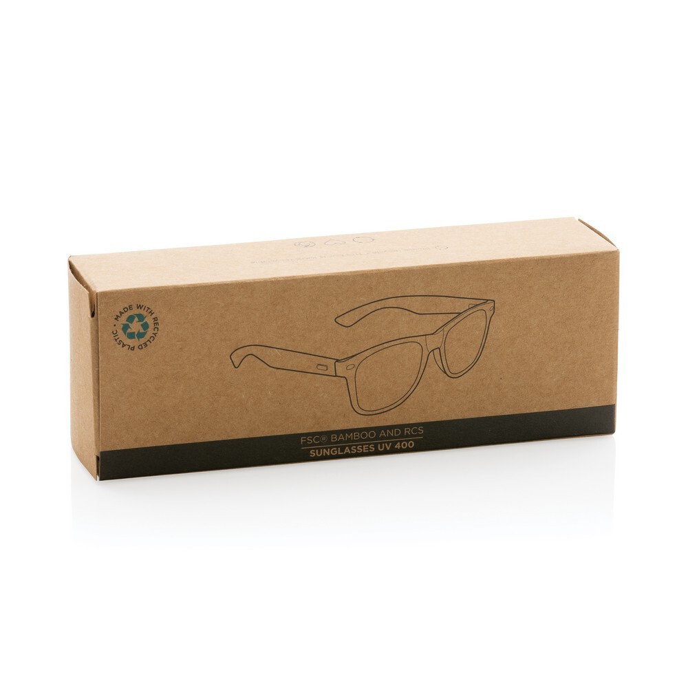 Okulary przeciwsłoneczne z filtrem UV400, wykonane z PC z recyklingu, zauszniki wykonane w 100% z bambusa z certyfikatem FSC®, pudełko z kraftowego papieru w komplecie