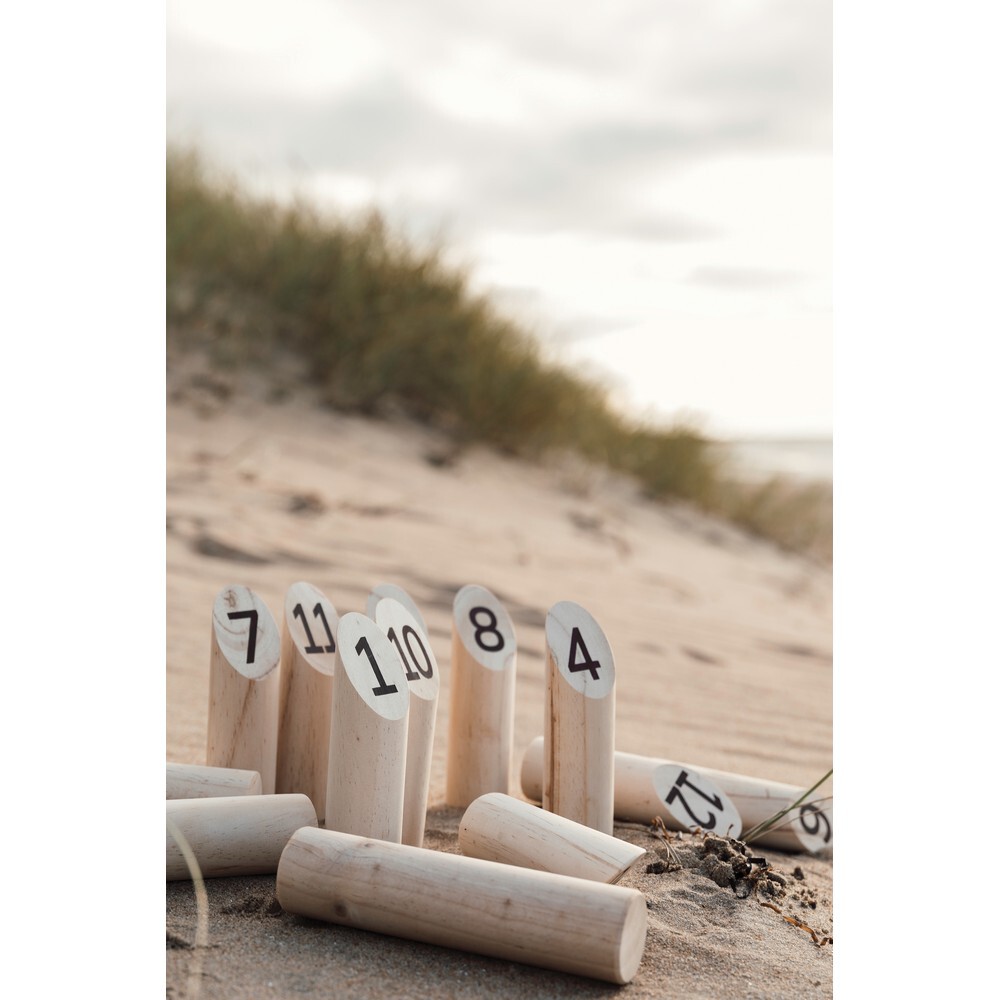 Drewniana gra taktyczna, celem gry jest rzut w 12 drewnianych kołków w taki sposób aby zdobyć dokładnie 50 punktów, po każdym rzucie kołki ustawiane są do pionu, zestaw zawiera 12 kołków oraz kij do rzucania, wykonane z drewna, pokrowiec oraz instrukcja z zasadami gry w komplecie