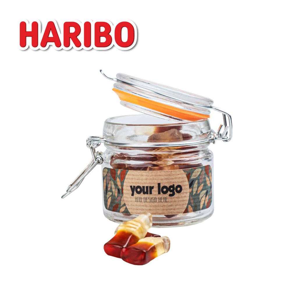 Szklany, personalizowany słoiczek, pełen kultowych żelków od marki HARIBO, świetnie sprawdzi się jako nośnik reklamy, który pomoże Ci skutecznie pozycjonować swoją markę na rynku.