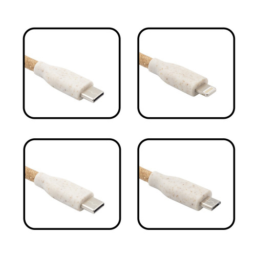 Korkowy kabel do ładowania B'RIGHT, elementy z włókien słomy pszenicznej, 120 cm, 4 końcówki: 2x USB typu C, micro USB oraz kompatybilna z urządzeniami iOS, końcówka USB typu C z funkcją transferu danych