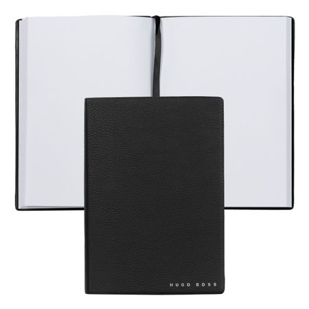 Ponadczasowy notatnik BOSS. Ten notatnik w formacie A5 zawierający 80 kartek wysokiej jakości papieru ozdobiony jest charakterystycznym logo na okładce. Okładka jest wykonana z czarnej sztucznej skóry o ziarnistej fakturze, która dodaje mu wyrafinowanego charakteru.