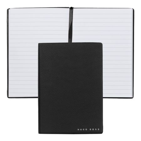 Ponadczasowy notatnik BOSS. Ten notatnik w formacie A5 zawierający 80 kartek wysokiej jakości papieru ozdobiony jest charakterystycznym logo na okładce. Okładka jest wykonana z czarnej sztucznej skóry o ziarnistej fakturze, która dodaje mu wyrafinowanego charakteru.