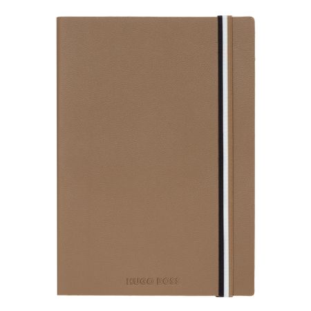 Wyrafinowany notatnik A5 BOSS z powlekanego materiału syntetycznego w czarnym odcieniu, z gumką z charakterystycznym paskiem i detalem z logo. Powlekany materiał syntetyczny, czasem nazywany sztuczną skórą, przypomina wyglądem prawdziwą skórę i ma matowe, błyszczące, gładkie, teksturowane lub powlekane wykończenie.