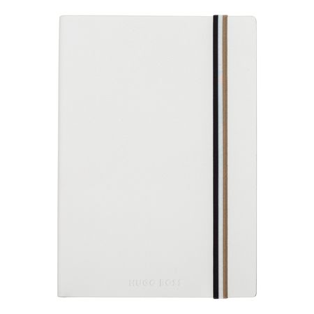 Wyrafinowany notatnik A5 BOSS z powlekanego materiału syntetycznego w czarnym odcieniu, z gumką z charakterystycznym paskiem i detalem z logo. Powlekany materiał syntetyczny, czasem nazywany sztuczną skórą, przypomina wyglądem prawdziwą skórę i ma matowe, błyszczące, gładkie, teksturowane lub powlekane wykończenie.