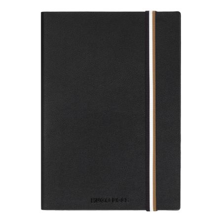 Wyrafinowany notatnik A5 BOSS z powlekanego materiału syntetycznego w czarnym odcieniu, z gumką z charakterystycznym paskiem i detalem z logo. Powlekany materiał syntetyczny, czasem nazywany sztuczną skórą, przypomina wyglądem prawdziwą skórę i ma matowe, błyszczące, gładkie, teksturowane lub powlekane wykończenie.