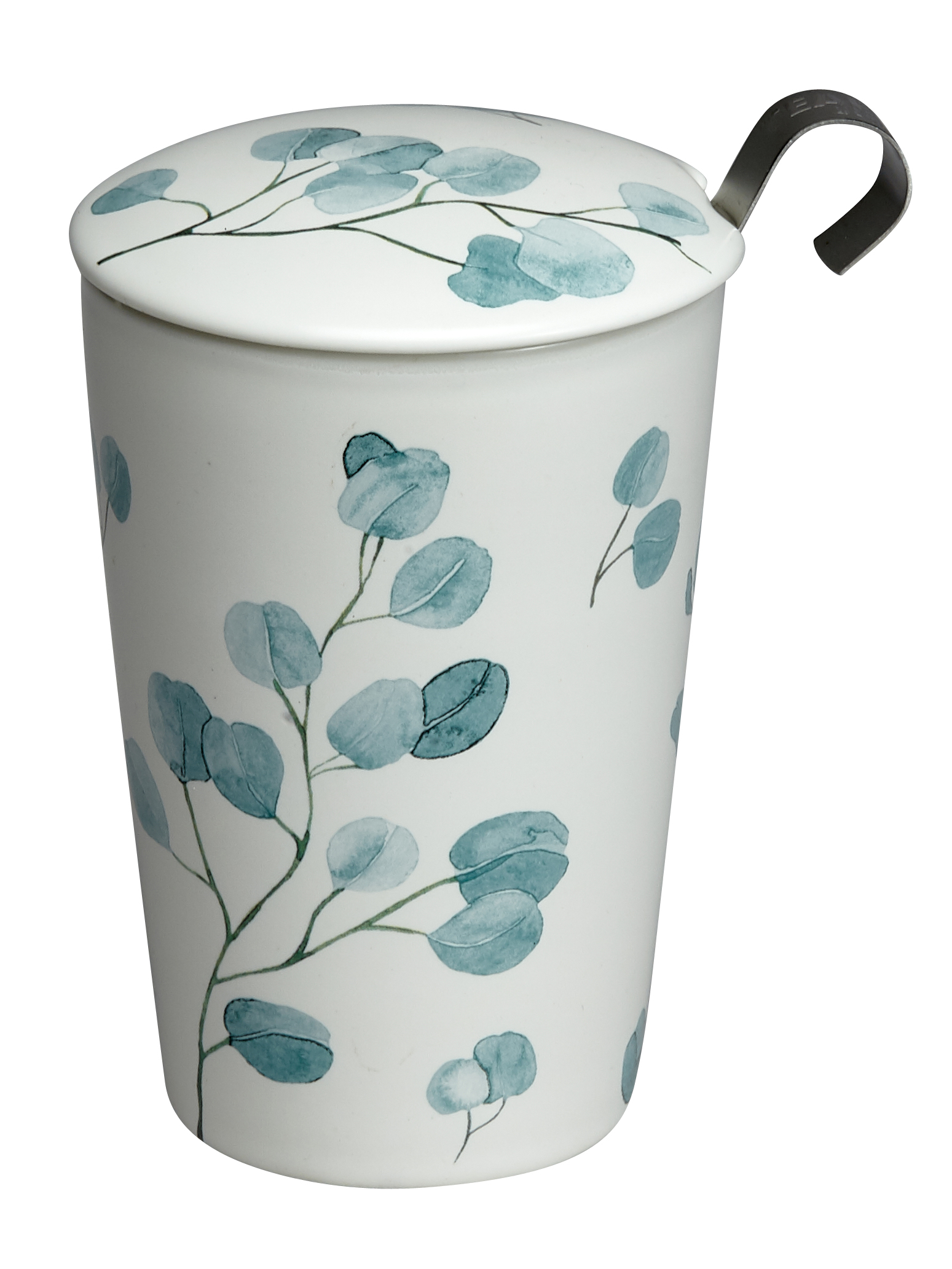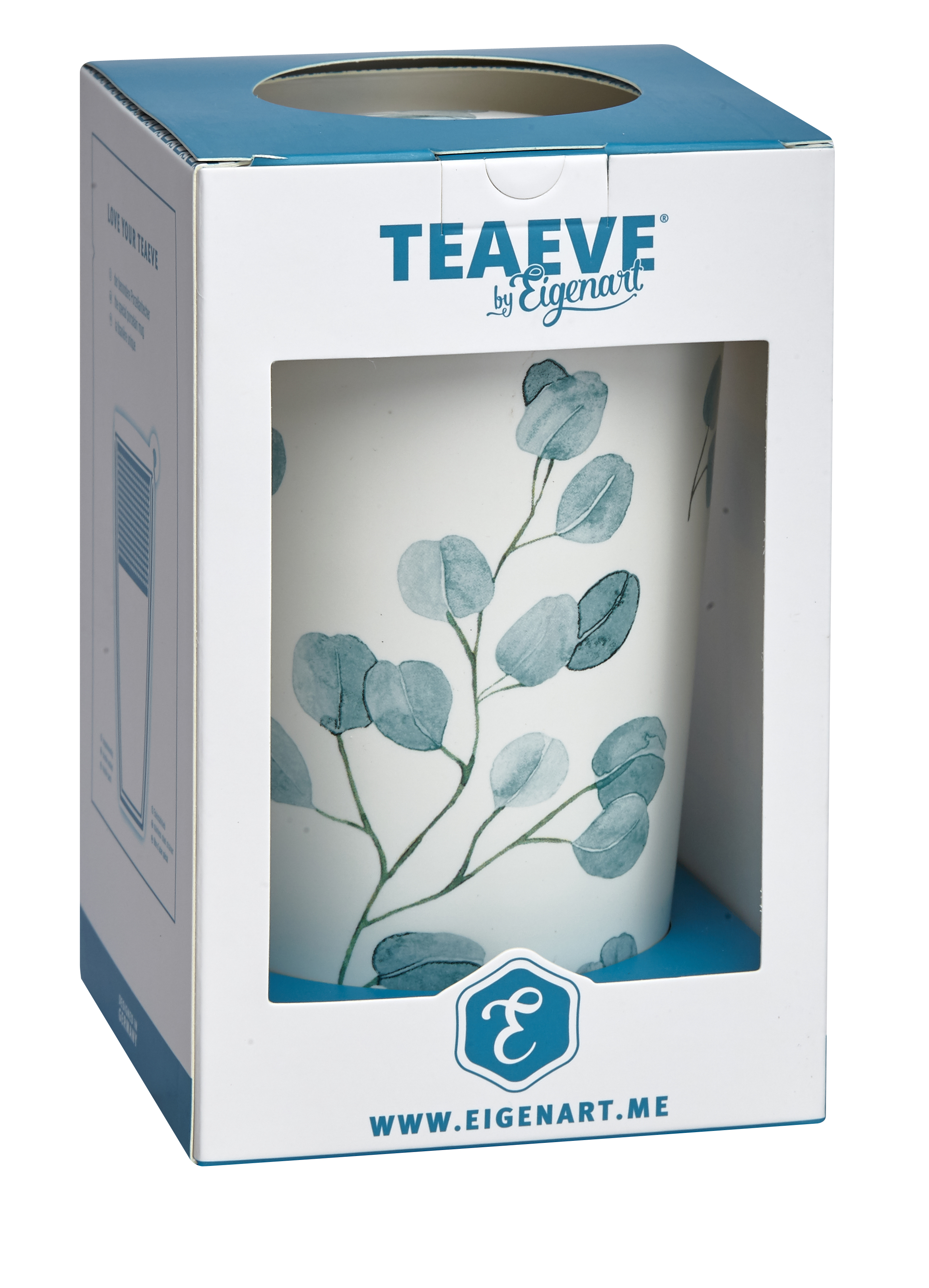 Porcelanowy kubek TeaEve serii Trees Eucalyptus o pojemności 350ml ze stalowym, wyjmowanym zaparzaczem i pokrywką to propozycja marki Eigenart do zaparzania ziół i herbat. Dzięki podwójnym ściankom i przykrywce, napój utrzymuje odpowiednią temperaturę i aromat na dłużej. Produkt pakowany jest w eleganckie pudełko prezentowe.