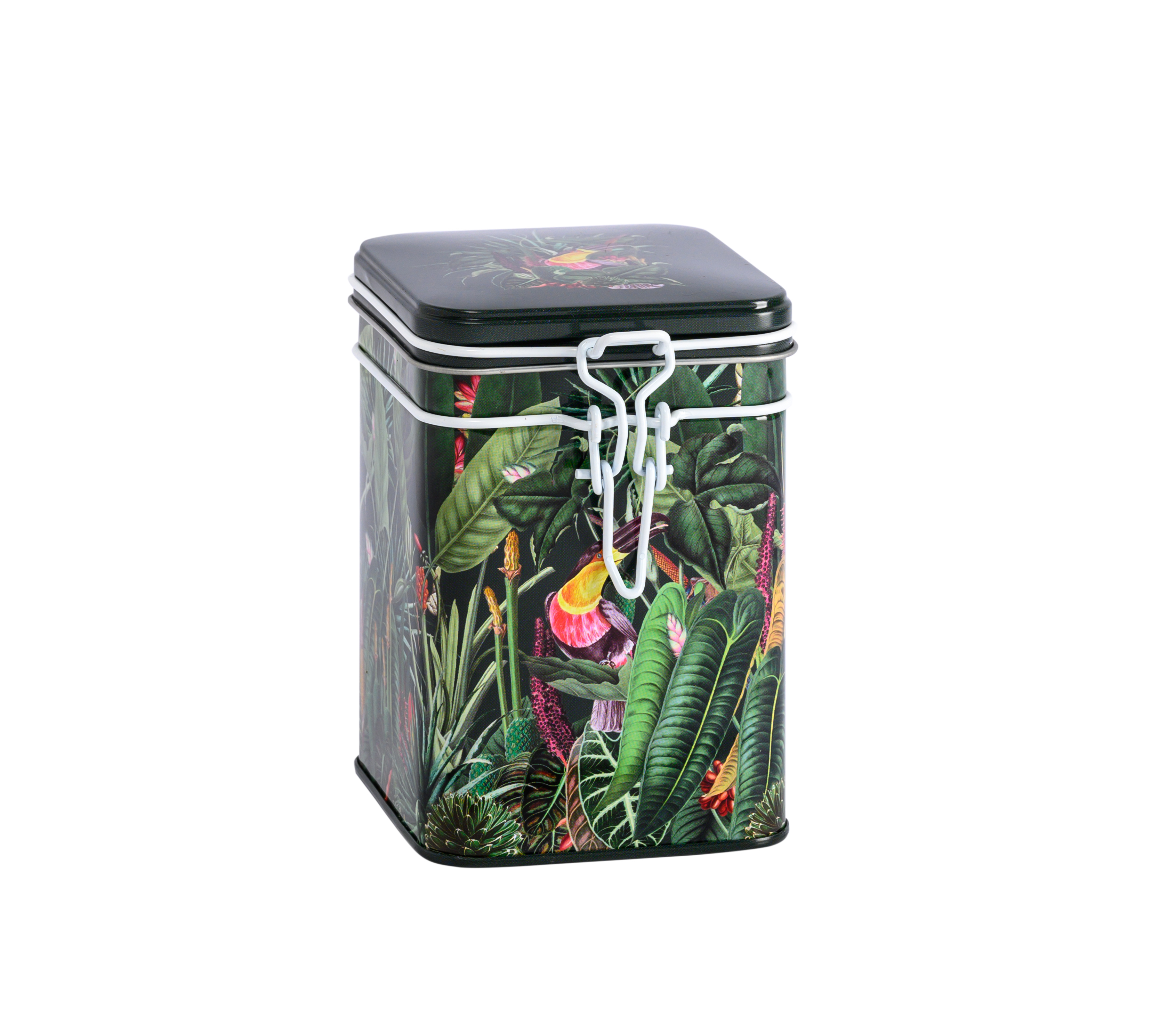 Puszka na herbatę z serii Rainforest dark wykonana jest ze stali nierdzewnej, pozawala na przechowywanie herbat liściastych i innych produktów sypkich, utrzymując ich aromat na dłużej. Posiada klipsowe zamknięcie, miękką w dotyku, barwną powierzchnię. Bezpieczna do kontaktu z żywnością. Pojemność 150g (zależna od rodzaju wypełnienia). Nie nadaje się do mycia w zmywarkach i użytku w kuchenkach mikrofalowych.
