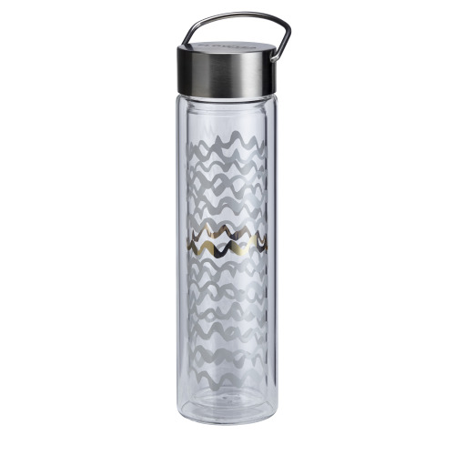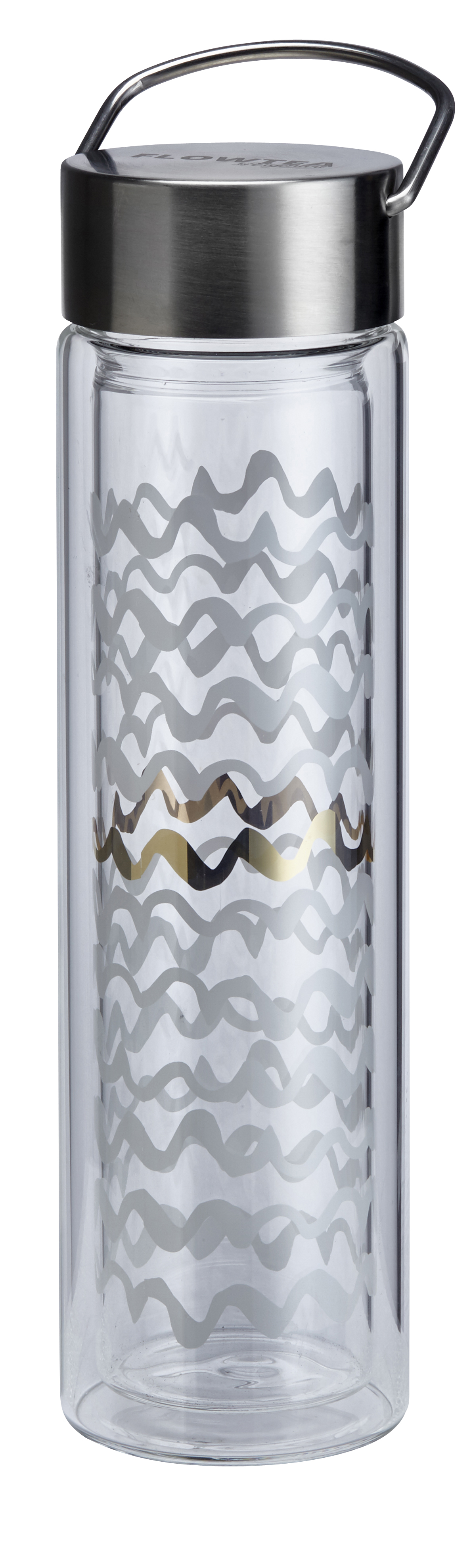 Butelka z podwójną ścianką z serii Flowtea Black&White wykonana jest z wysokiej jakości szkła boro-krzemowego. Posiada wyjmowany, stalowy zaparzacz oraz stalową zakrętkę z uchwytem. Dzięki podwójnym ściankom napój utrzymuje swoją odpowiednią temperaturę przez dłuższy czas. W zestawie znajduje się neoprenowy pokrowiec. Produkt pakowany jest w eleganckie pudełko prezentowe. Pojemność 350-400ml. Zalecane mycie ręczne. Nie należy używać w mikrofalówkach.