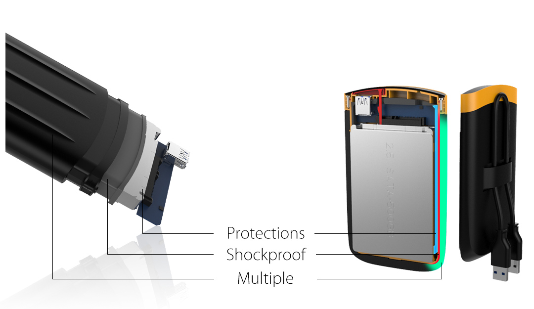 Urządzenie A65, należące do serii Armor, spełnia wymogi specyfikacji odporności na kurz i wodę IP67. Obudowa wykonana z trzech warstw, w tym dwóch warstw gumy z umieszczonym pomiędzy jednolitym „szkieletem”, zapewnia ochronę nie tylko przed zanurzeniem, ale także przed wstrząsami i uderzeniami. Dzięki temu Armor A65 spełnia wymogi militarnej klasy ochrony MIL-STD-810G. Ponadto, producent wraz ze sprzętem udostępnia oprogramowanie szyfrujące oraz umożliwiające tworzenie kopii zapasowej plików. Co więcej, zastosowany interfejs USB 3.1 Gen1 (USB 3.0) jest kompatybilny wstecznie z wcześniejszymi wersjami. Kabel danych, zapewniający jednocześnie zasilanie, jest mocowany za pomocą zaczepów na obudowie urządzenia, dzięki czemu nie zapomnimy o nim.