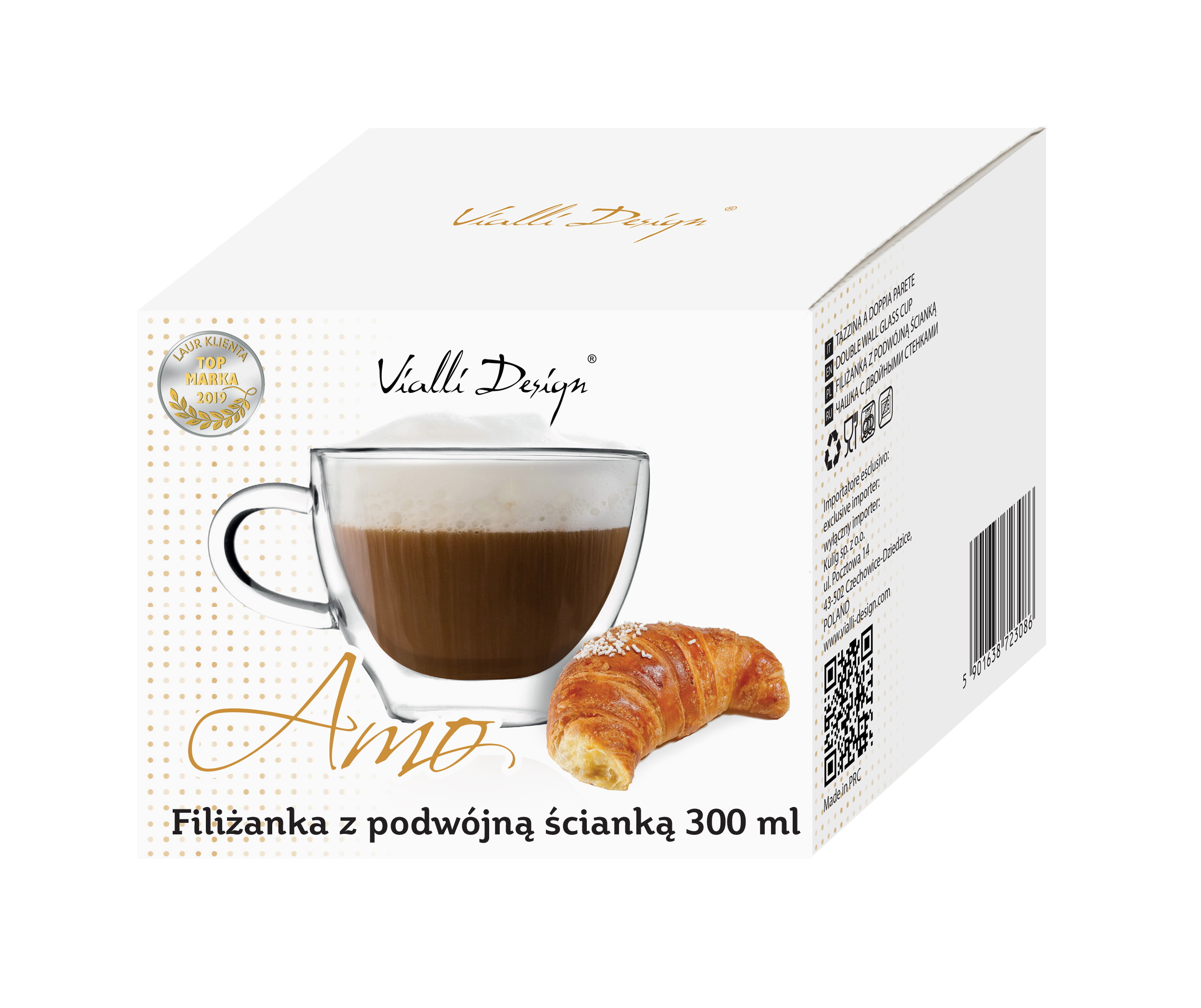 Praktyczne i pojemne filiżanka z serii Amo marki Vialli Design. Produkt został wykonany z najwyższej jakości szkła boro krzemowego, które charakteryzuje się niezwykłą odpornością na szok termiczny. Naczynie, dzięki podwójnym ściankom nie tylko utrzymuje odpowiednią temperaturę napoju na dłużej, ale też chroni przed poparzeniem, dzięki czemu bez obaw możemy trzymać ją w dłoni nawet, gdy pijemy gorącą herbatę czy kawę. Szklanki posiadają klasyczny ale zarazem nowoczesny kształt, który idealnie leży w dłoni. Doskonale nadaje się do serwowania zarówno gorących jak i zimnych napojów, oraz jako prezent na każda okazję.