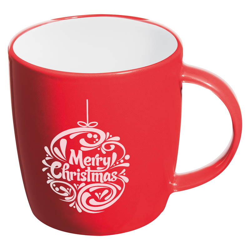 Kubek o pojemności 300ml został wykonany z ceramiki. Gadżet w kolorze czerwonym, jest dostępny w dwóch wersjach graficznych: z białą grafiką bombki i napisem „Merry Christmas” oraz z białą grafiką choinki.