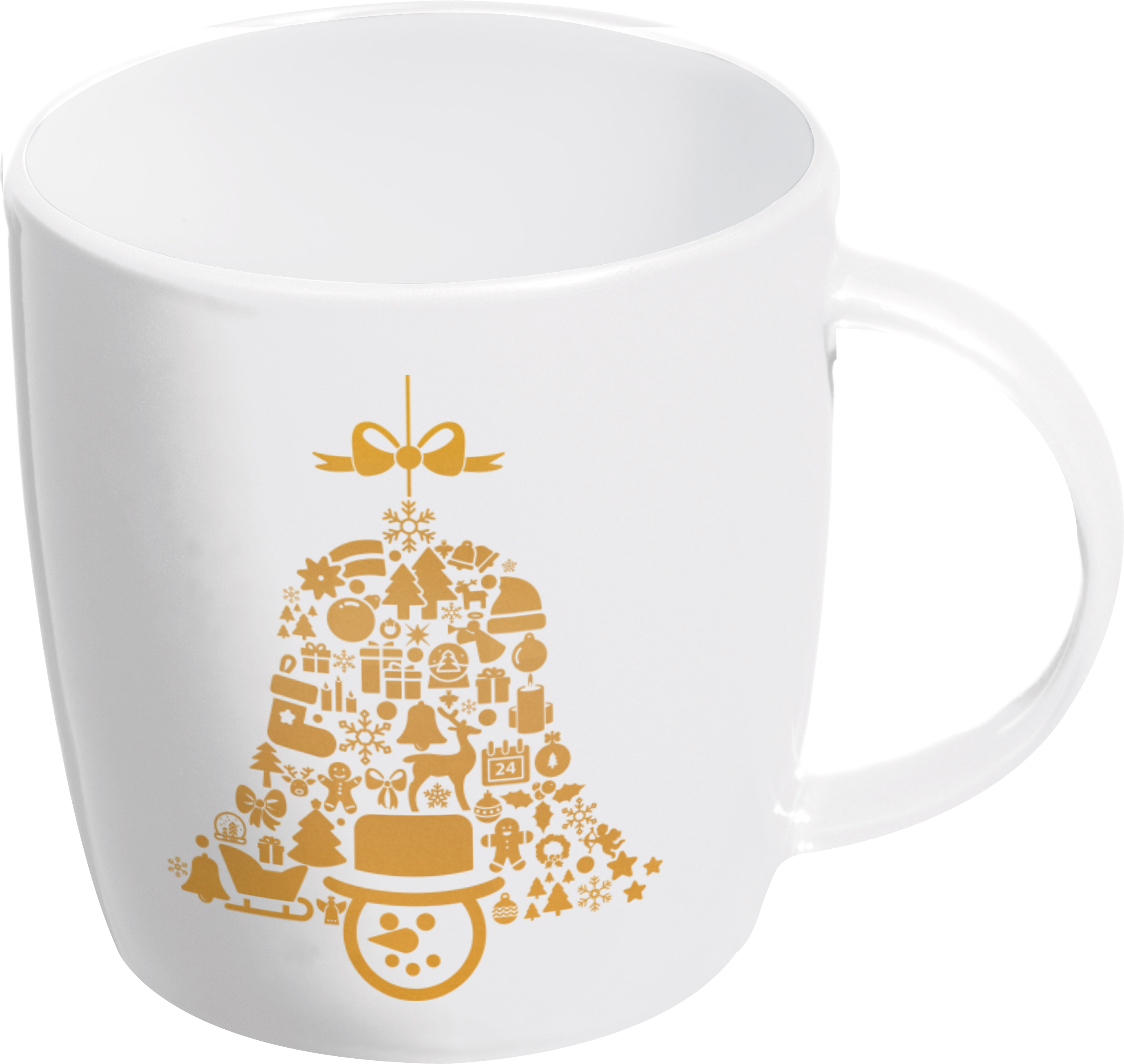 Kubek dostępny jest w 3 wersjach kolorystycznych i graficznych, biały kubek z choinką w kolorze khaki, biały kubek z czerwonym reniferem oraz biały kubek ze złotym dzwoneczkiem.