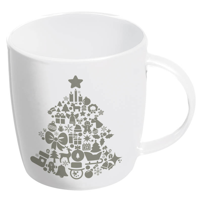 Kubek dostępny jest w 3 wersjach kolorystycznych i graficznych, biały kubek z choinką w kolorze khaki, biały kubek z czerwonym reniferem oraz biały kubek ze złotym dzwoneczkiem.