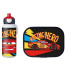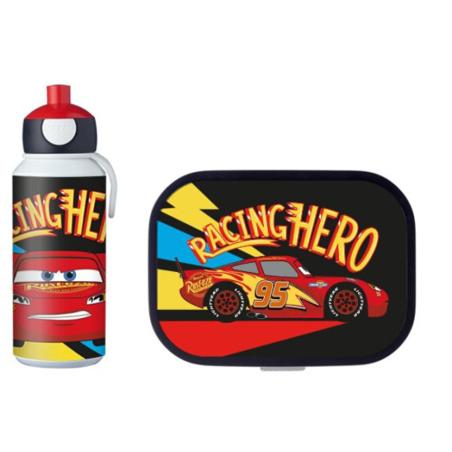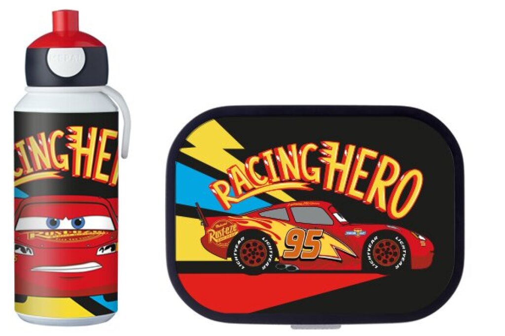 Zestaw składający się z pudełka śniadaniowego i butelki ozdobiony efektownym, kolorowym motywem autka.
