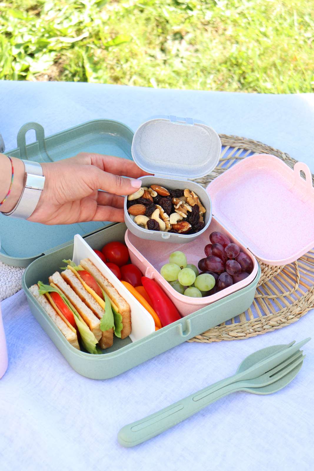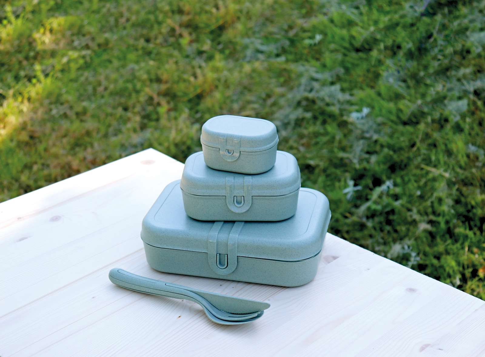 Zestaw lunchboxów Pascal ready organic to praktyczny zestaw pojemników na żywność, składający się z 3 lunchboxów różnej wielkości (które mieszczą się jeden w drugim) oraz 3 składanych sztućców turystycznych. Całość doskonale sprawdzi się gdy chcemy zabrać posiłek do pracy, szkoły, na wycieczkę. Pojemników możemy używać razem lub osobno. Dzięki systemowi modułowemu Twoje własne pudełko bento można codziennie rekonfigurować i dopasować do przepisu dnia! Produkt ten jest trwały, lekki, łatwy w transporcie i czyszczeniu. Posiada kopaktowy rozmiar, łatwe zamykanie na klips, wykonany z nowatorskiego, przyjaznego dla środowiska tworzywa sztucznego Organic, w kórego skład wchodzi celuloza - w 100% podlega recyclingowi. W zestawie składane sztućce Klikk.