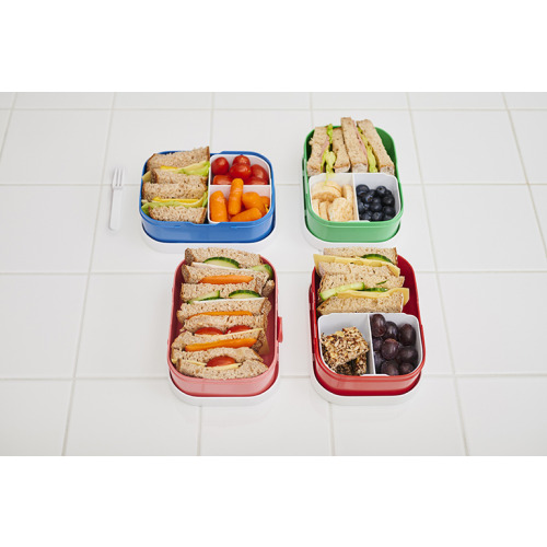 Posiada on dodatkowy wkład przeznaczony na warzywa lub owoce, po jego wyjęciu pomieści do 4 kanapek. Jest łatwy w utrzymaniu czystości - nadaje się do mycia w zmywarce, w zestawie również jest mały widelczyk.