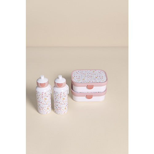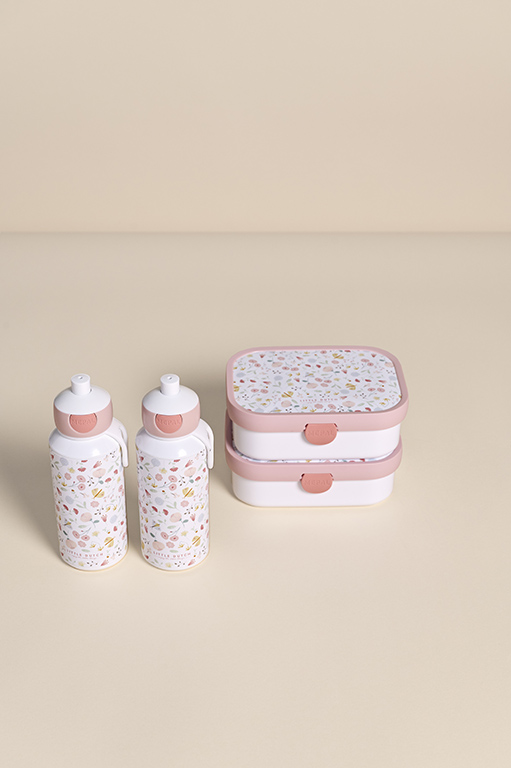 Zestaw Campus marki Mepal składający się z pudełka śniadaniowego i butelki, ozdobiony efektownym, kolorowym nadrukiem.