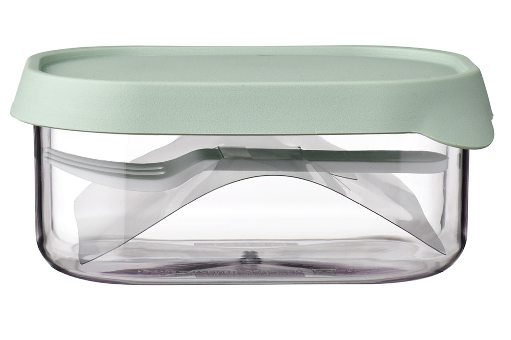 Posiada transparentny korpus wykonany z trwałego i odpornego na uszkodzenia mechaniczne tworzywa sztucznego, dopasowaną, ergonomiczną pokrywę z wypustką ułatwiającą otwieranie i zamykanie, dodatkowo wyposażone jest w widelczyk, dlatego możemy cieszyć się zdrową, pełną witamin przekąską w każdym miejscu - w podróży, pracy lub szkole.