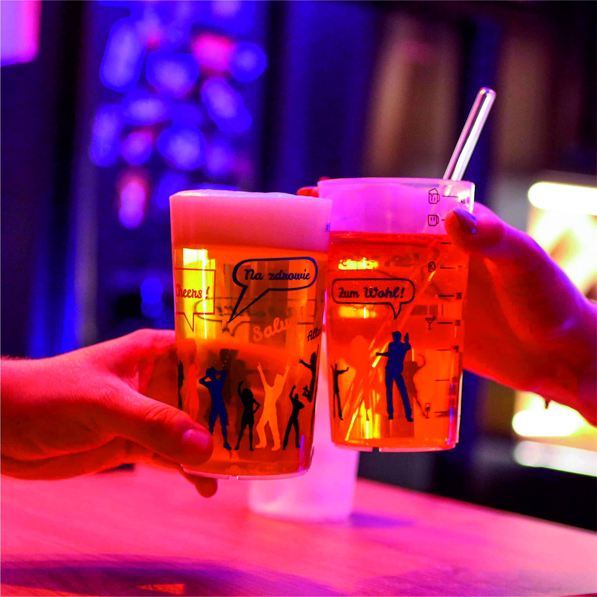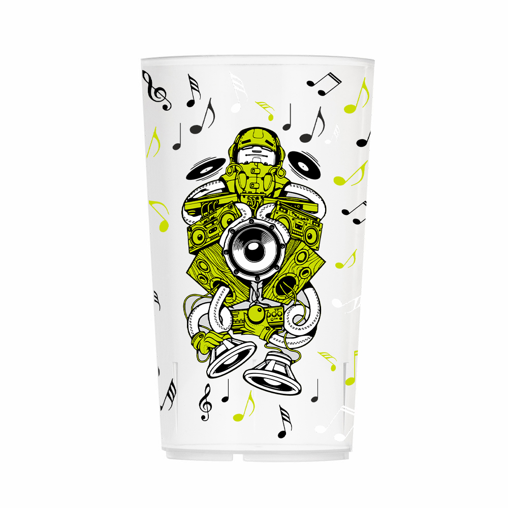Kubek wykonany z trwałego tworzywa, wielorazowego użytku, nadający się do mycia w zmywarkach i wielokrotnego używania na imprezach. Ma pojemność 200 ml lub 400ml i jest wykonany z materiału przeznaczonego do kontaktu z żywnością.