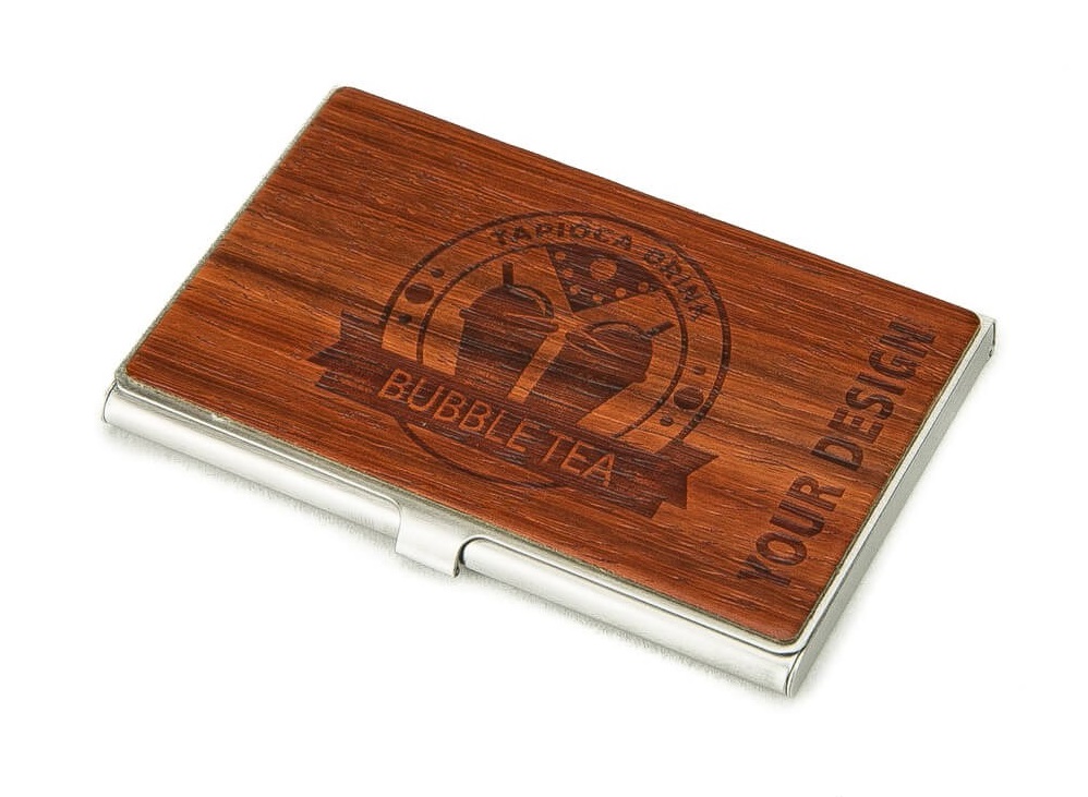 Wizytownik drewniany z możliwością personalizacji w postaci logo firmowego lub innej grafiki. Wizytownik to praktyczny i elegancki dodatek, który mieści 15 wizytówek. Niewielkie wymiary (90 mm x 58 mm x 10 mm) sprawiają, że produkt jest lekki i poręczny. Domyślnie grawer umieszczany jest w centralnej części.