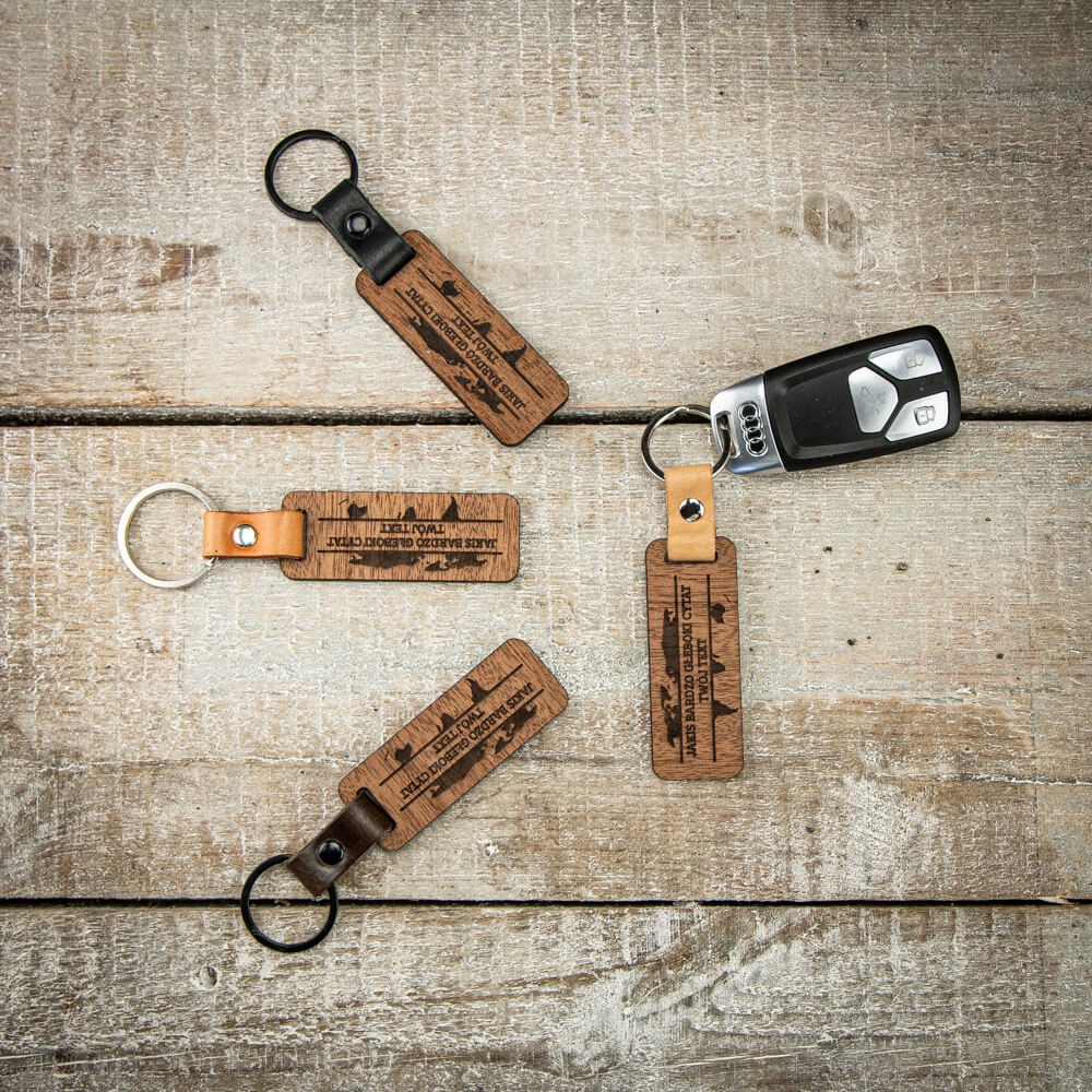 Unikatowy brelok do kluczy o prostej formie zamkniętego paska, zakończonego z jednej strony trwałym, metalowym kółkiem (do wybory grafitowy lub srebrny), na którym przypinamy klucze, z drugiej zaś specjalnie zaprojektowanym drewnianym wzorem. Pasek wykonany jest z naturalnej bydlęcej skóry dostępnej w 4 kolorach: czarnej, brązowej, koniakowej i naturalnej. Możliwość personalizacji: dwie linijki tekstu po max 30 znaków każda.