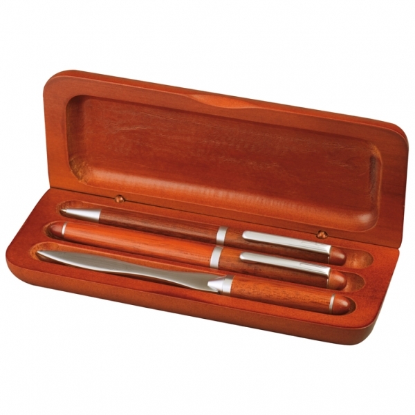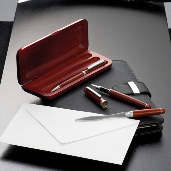 Zestaw piśmienniczy z drzewa różanego BANGKOK, składa się z: drewnianego długopisu z niebieskim, metalowym wkładem, drewnianego pióra wiecznego z niebieskim nabojem oraz noża do otwierania listów. Całość zapakowana w drewniane etui.
