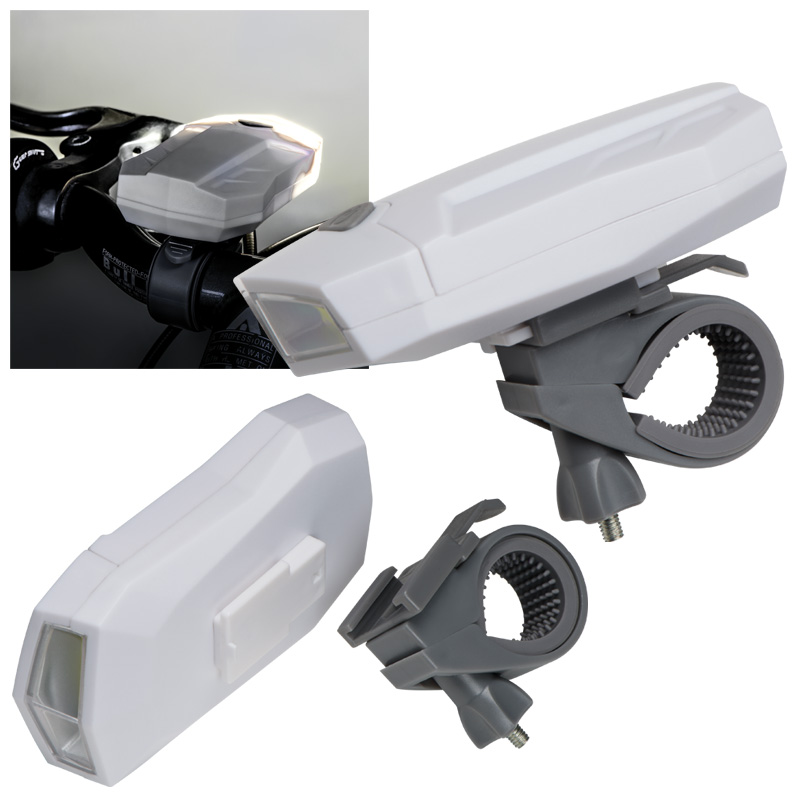 informacja: trzy tryby świecenia: jasne stałe, przyciemnione stałe, migoczące; zaczep do roweru