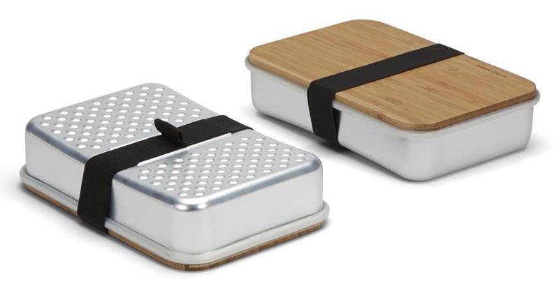 - aluminiowy pojemnik czyścić na sucho, deskę myć wodą z mydłem, wysuszyć, a raz w miesiącu przecierać olejem jadalnym lub do konserwacji drewna – zapobiegnie to pękaniu,