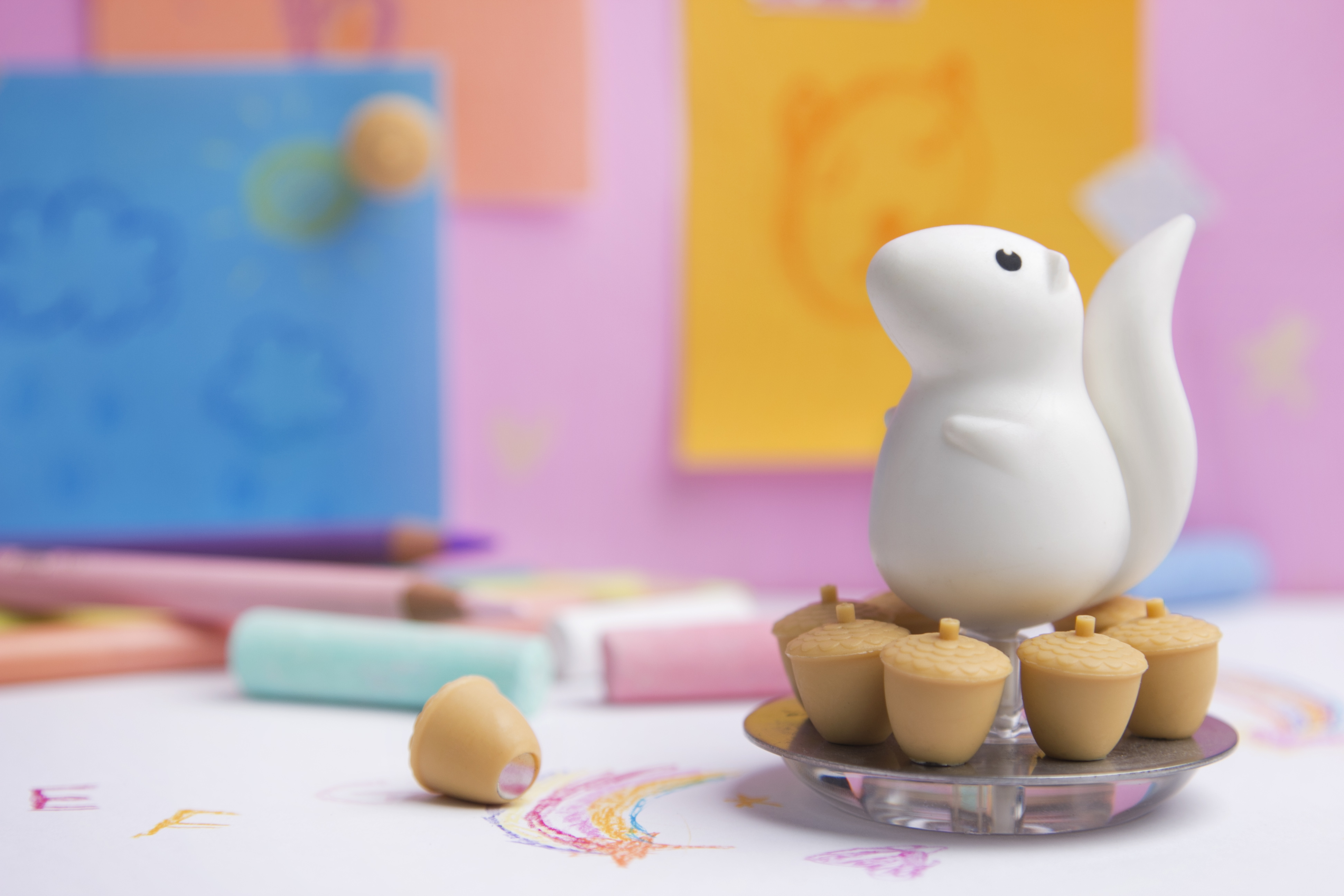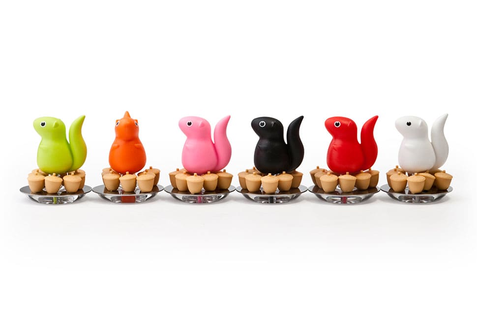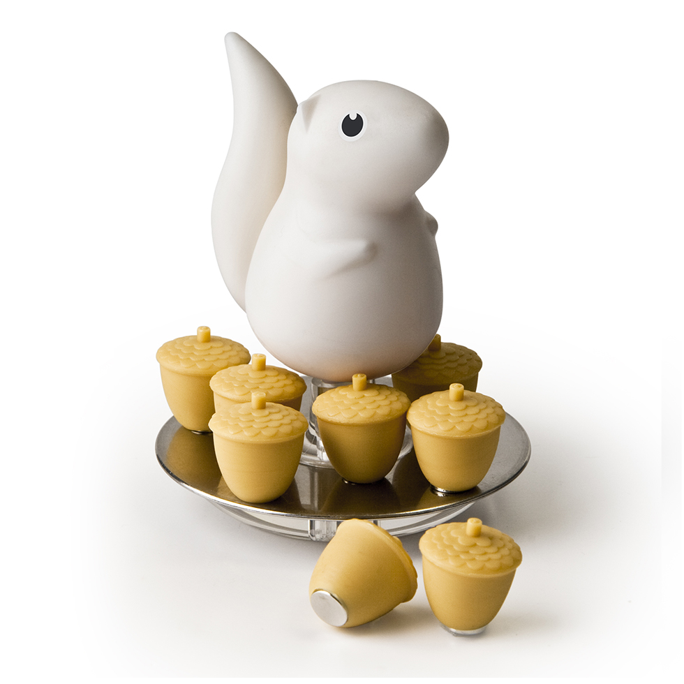 Sympatyczna wiewiórka pilnuje magnesów w kształcie żołędzi.