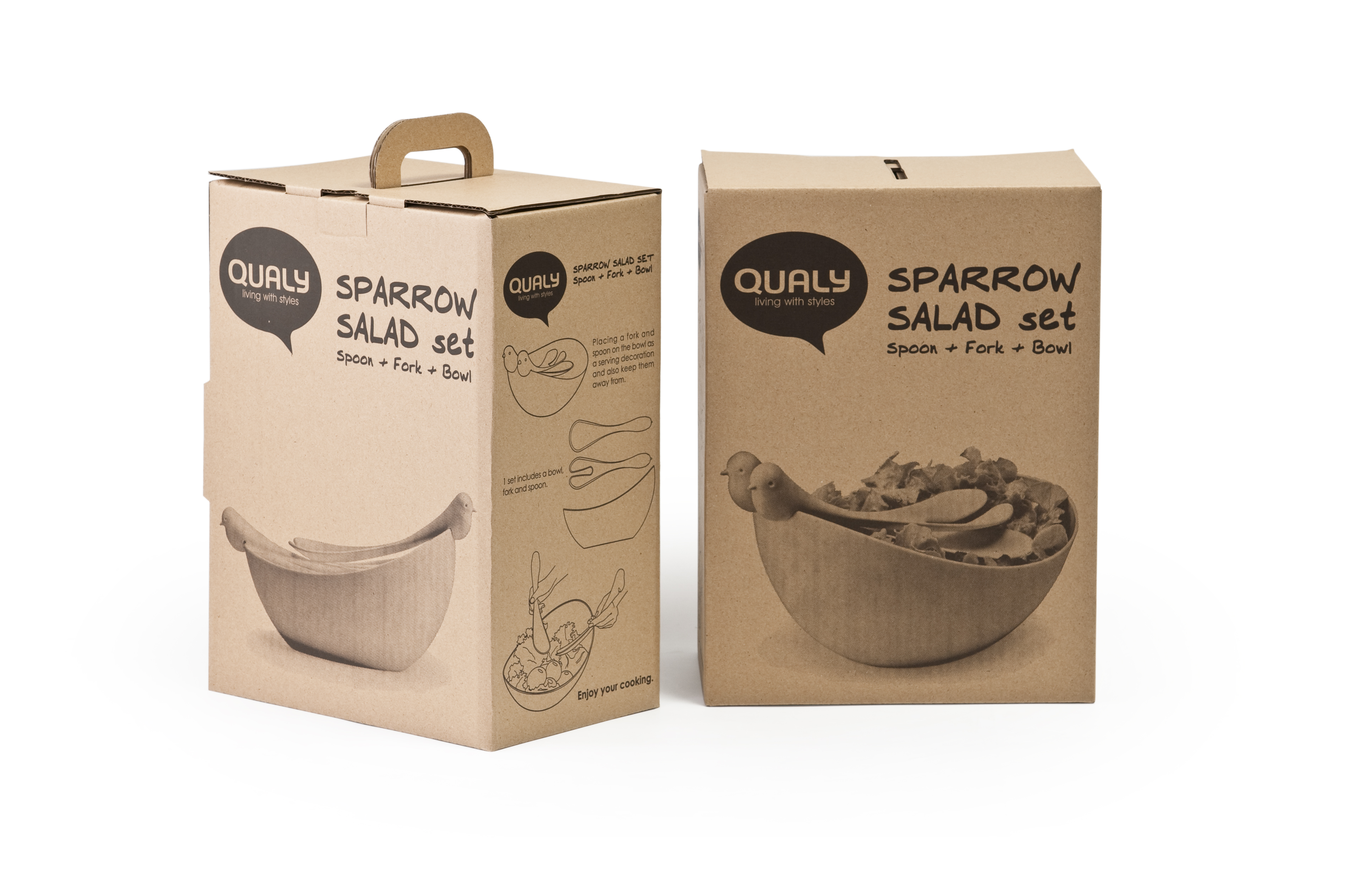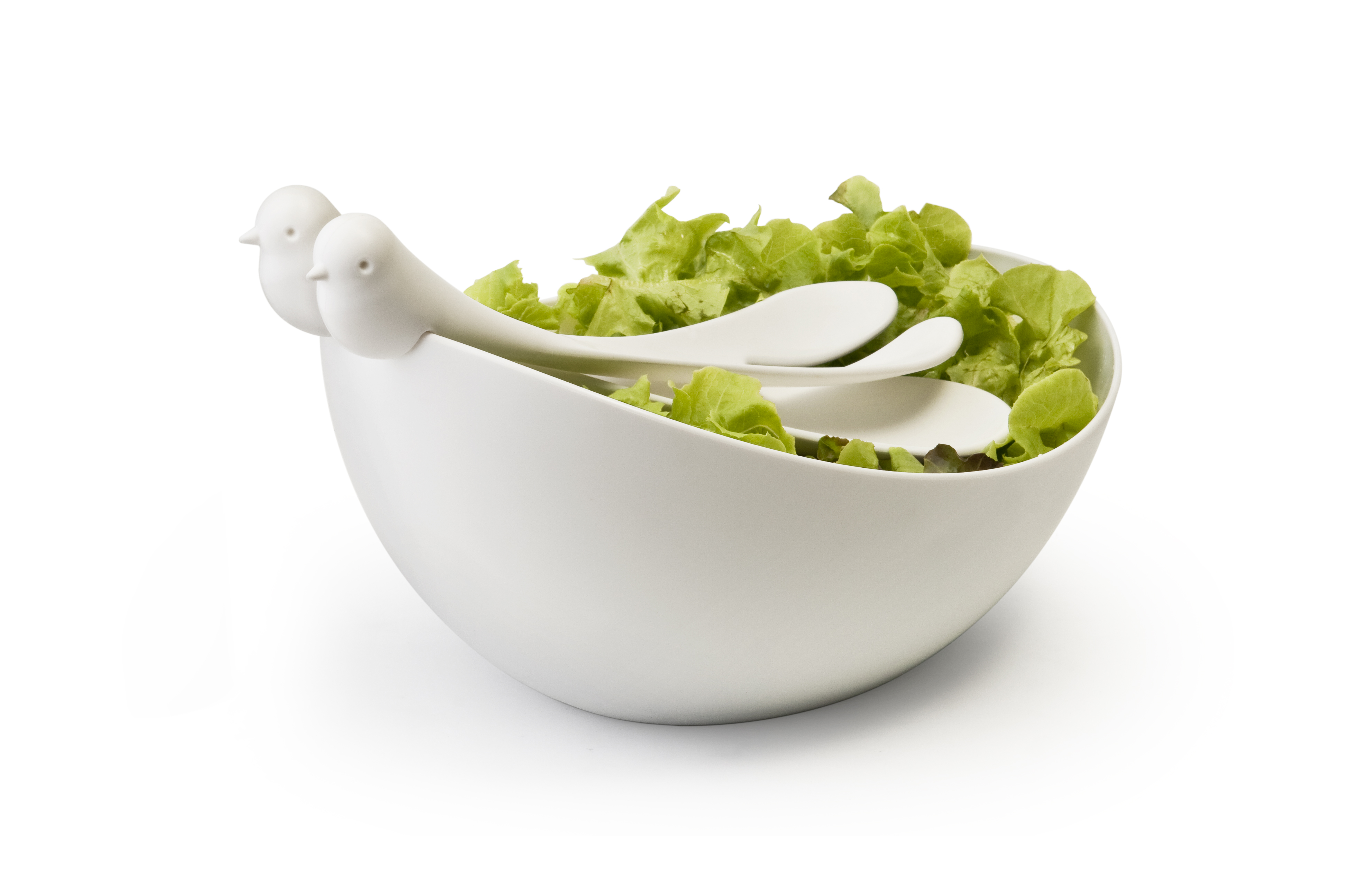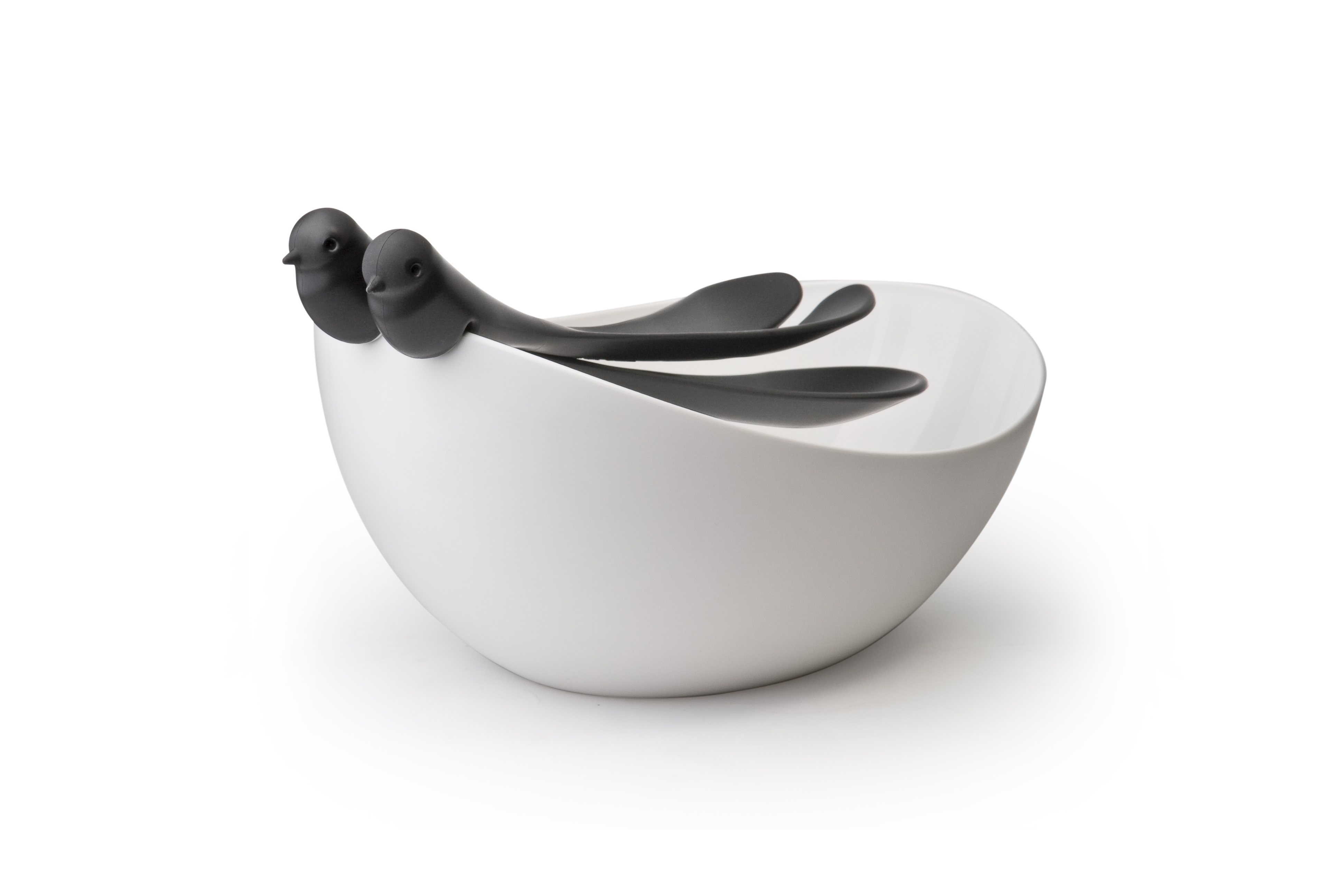 Wróbelki siedzące na szczycie miski, gotowe są pomóc Ci mieszać i podawać sałatki. Chociaż można ich używać osobno jako pojedynczych łyżek, doskonale ze sobą współpracują.