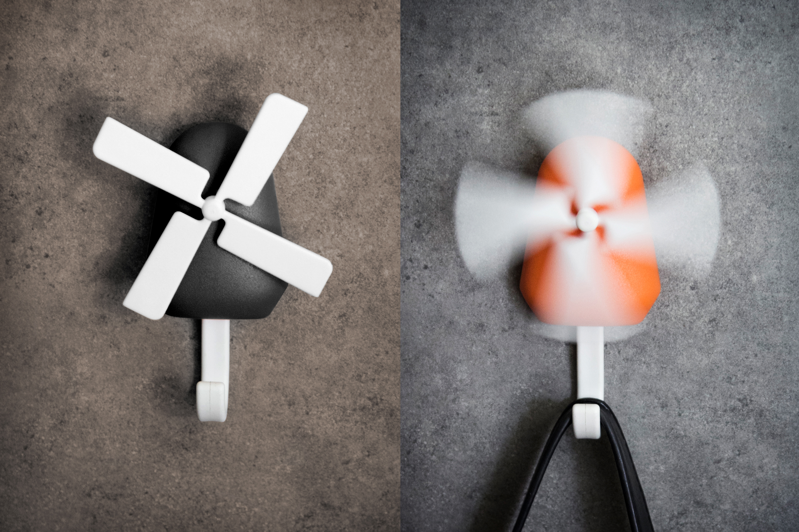 Ten mały wiatrak cię zdmuchnie! Za każdym razem, gdy zawiesisz przedmiot na haku, wiatrak zacznie się obracać, wskazując, że przedmiot jest bezpiecznie na haku.