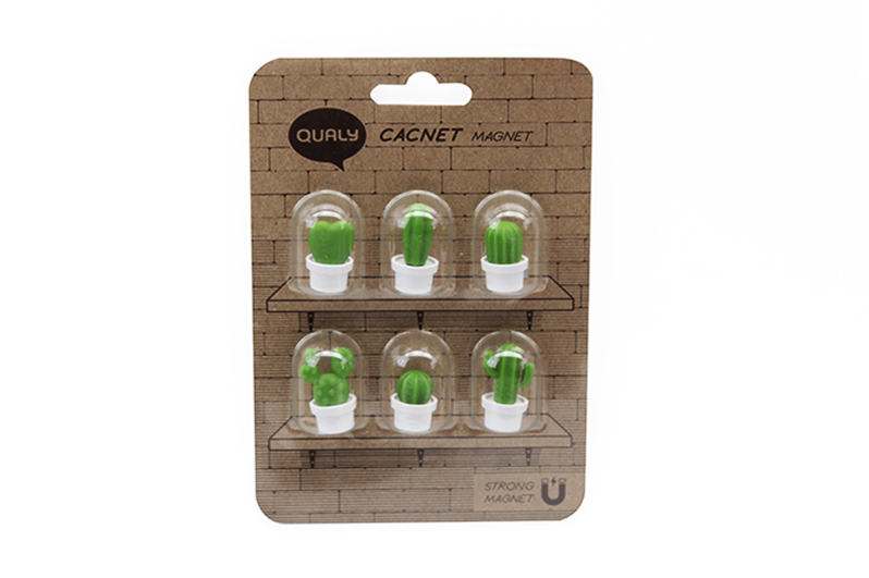 Zestaw 6 niebanalnych magnesów w kształcie kaktusów w doniczkach.