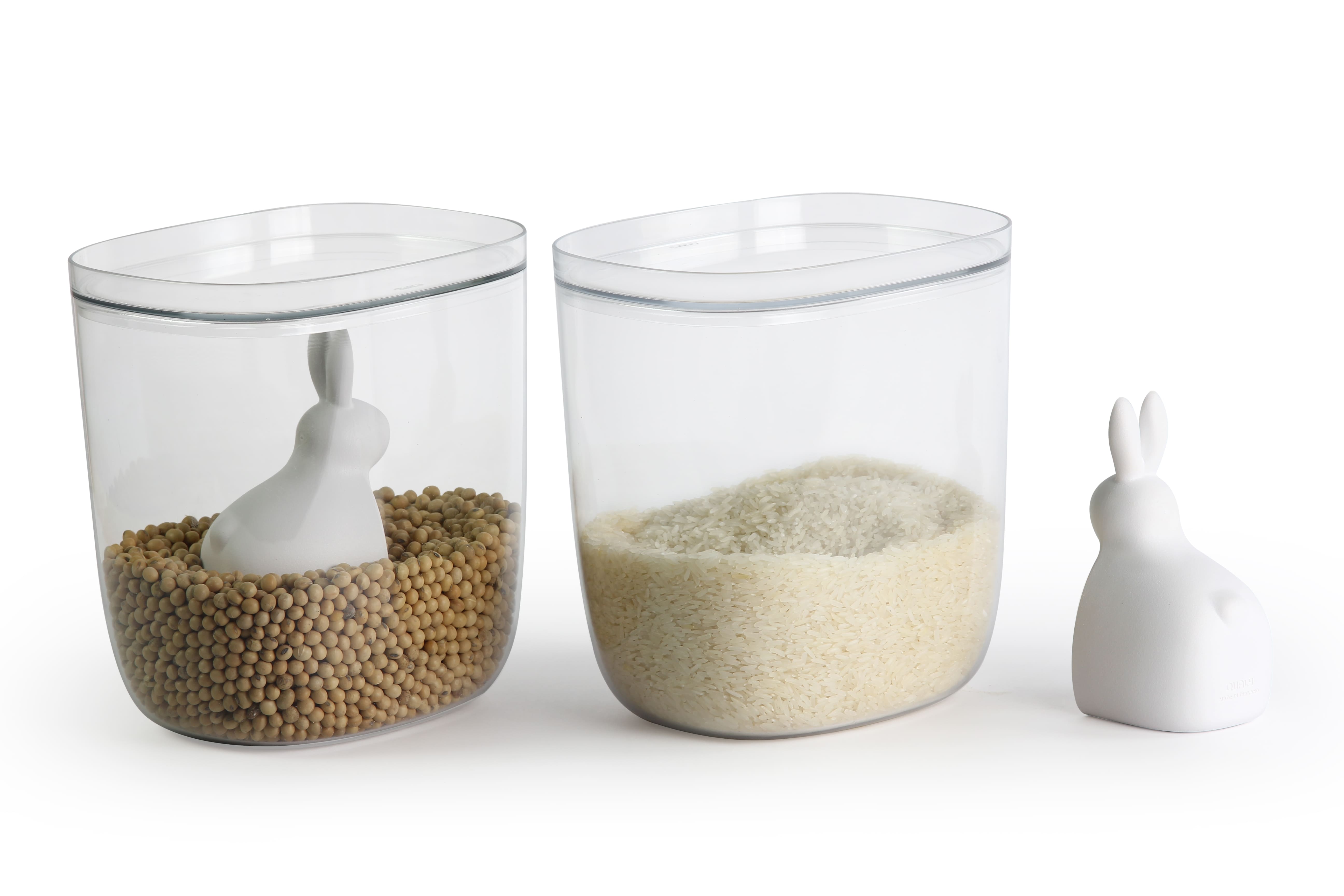 Spokojny króliczek pilnuje Twoich sypkich produktów w nocy i za dnia. Nie bój się mu powierzyć ryżu, mąki, czy cukru. Dzięki miarce odmierzysz odpowiednią ich ilość, a szczelna pokrywa pozwoli na utrzymanie świeżości na dłużej.
