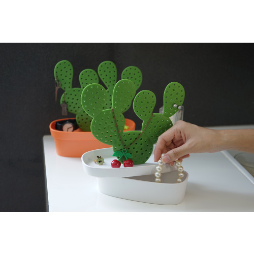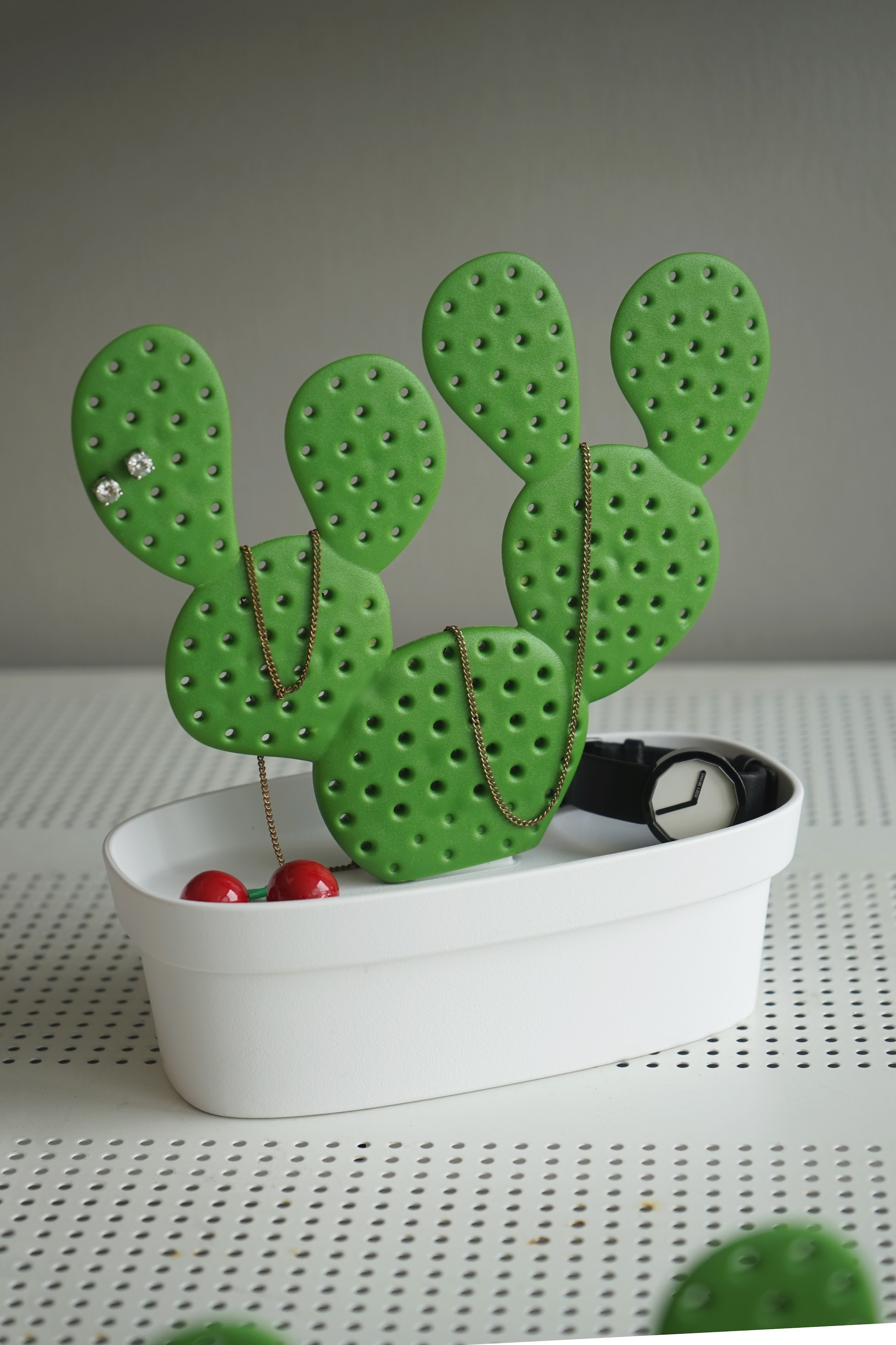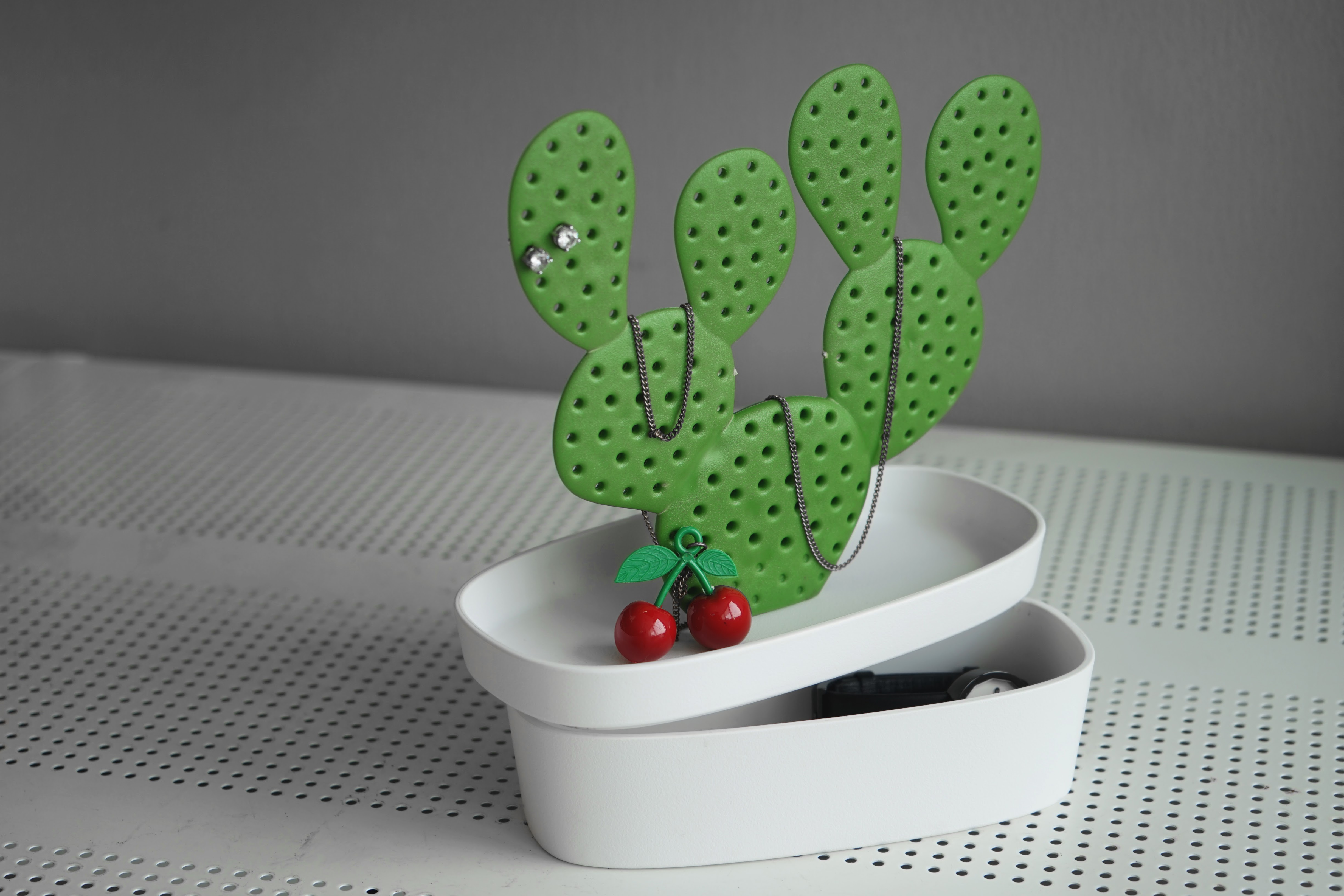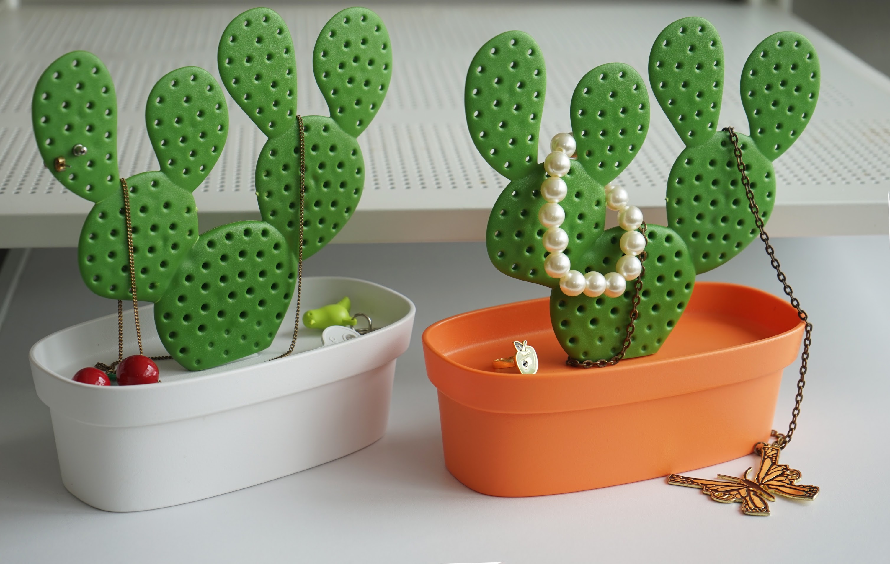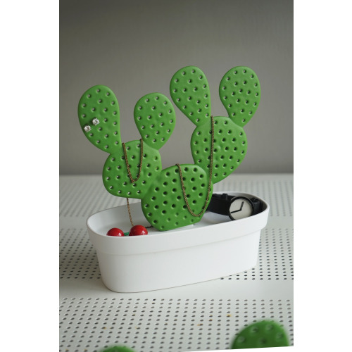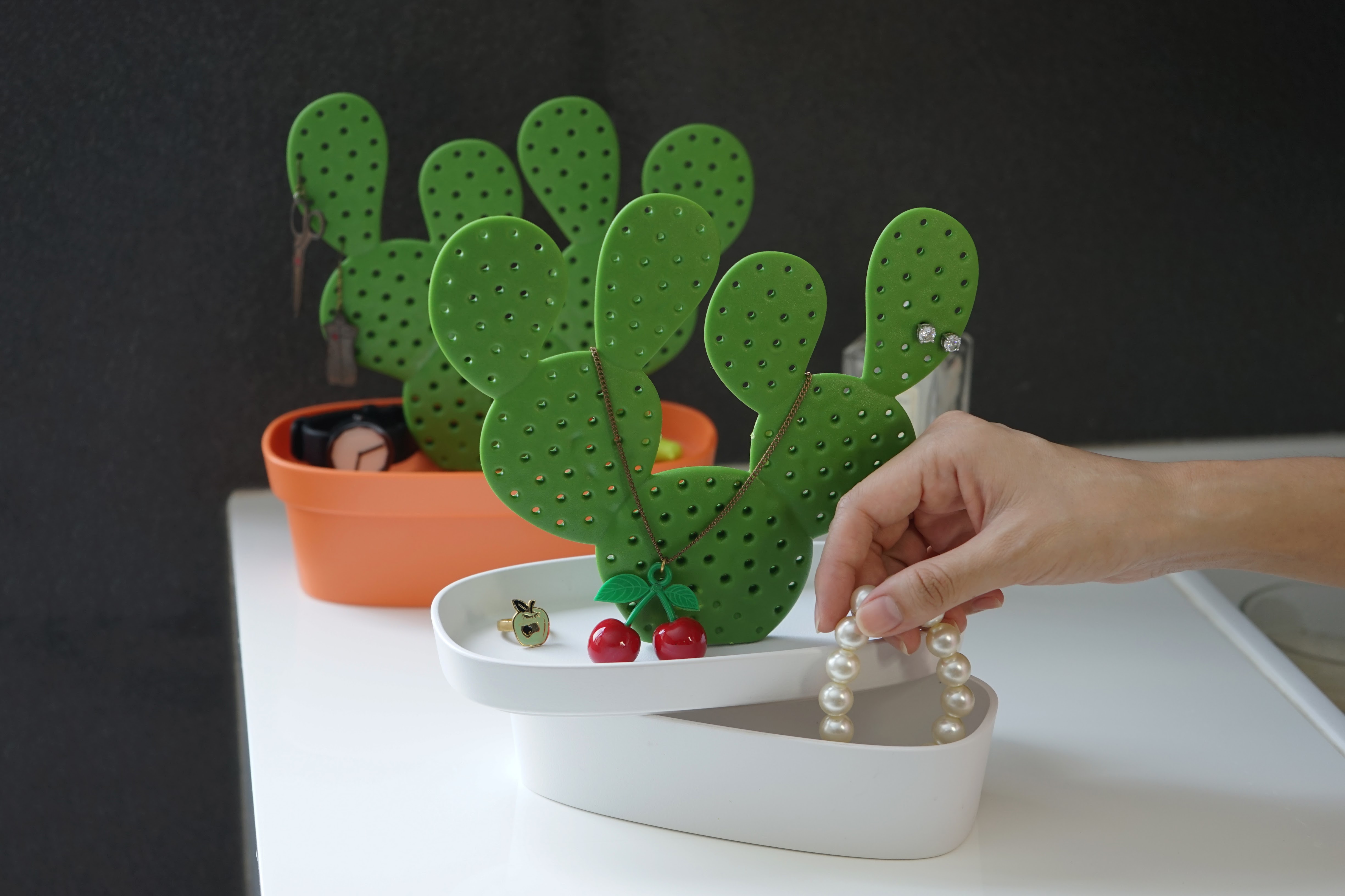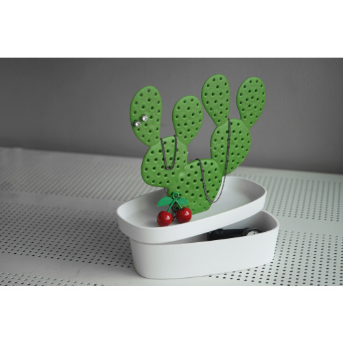 Nie musisz czekać aż kaktus zakwitnie. Po prostu umieść kolczyki na zielonej części stojaka, a akcesoria i pozostałą biżuterię możesz schować na lub w pojemniku pod nim. Stojak będzie również niebanalną i zaskakującą ozdobą w Twoim wnętrzu.