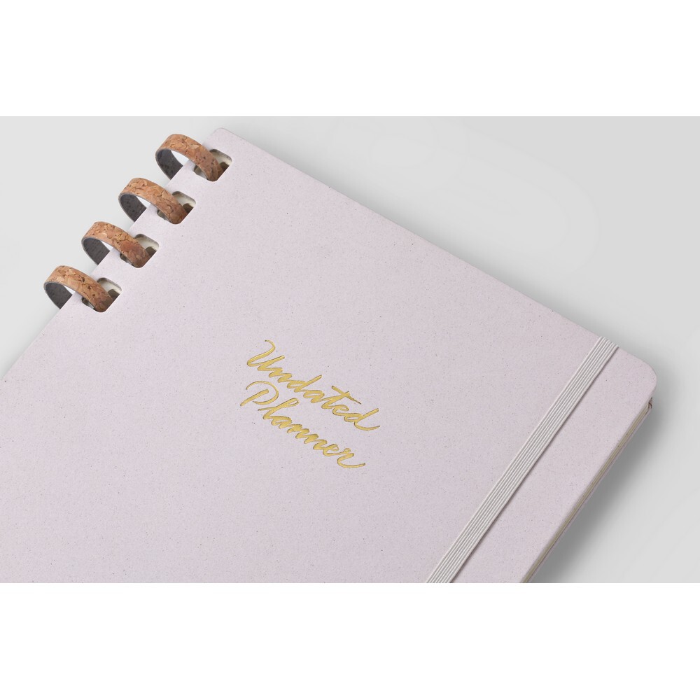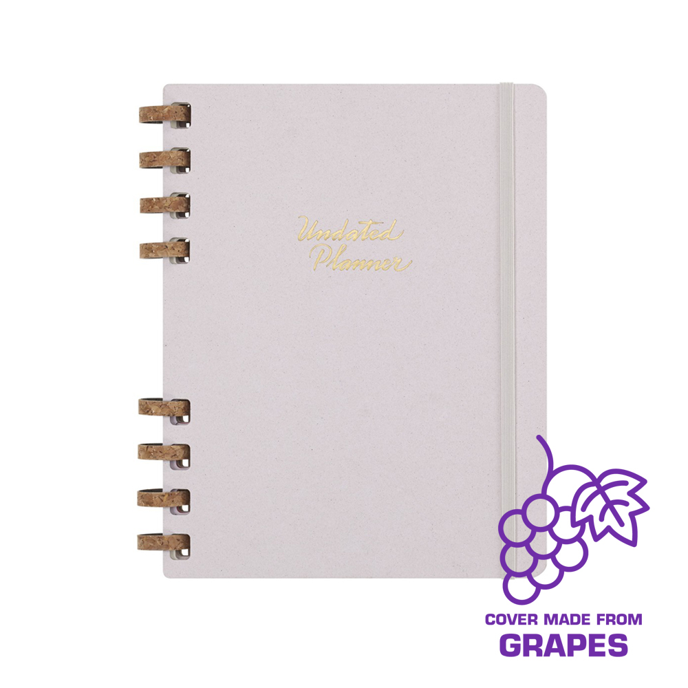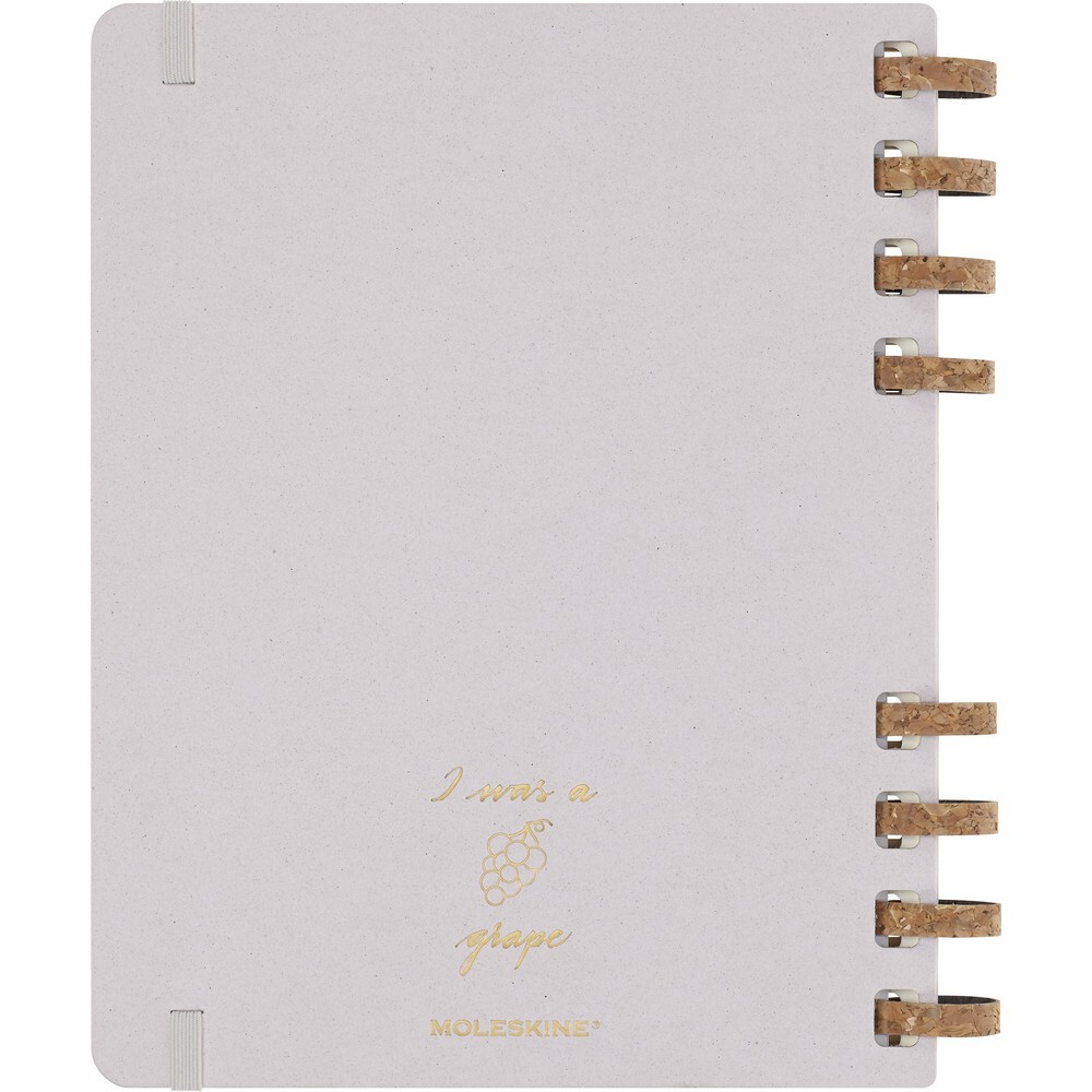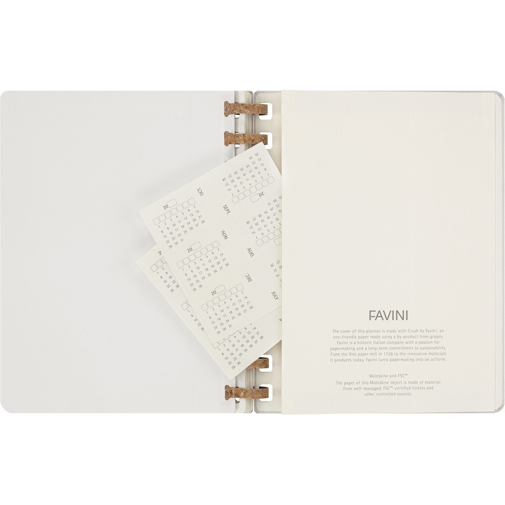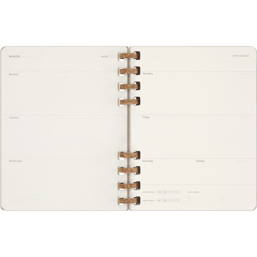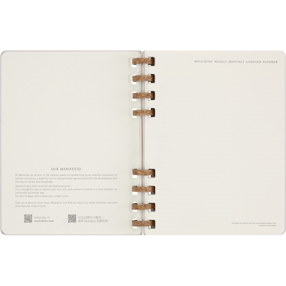 Spiralny kalendarz XL (ok. B5) MOLESKINE Undated Life, 12 konfigurowalnych przegródek na miesiące, 5 niedatowanych tygodni na miesiąc (każdy tydzień przedstawiony na dwóch stronach), przegląd roczny (4 datowane lata), 2 laminowane zakładki, twarda okładka wykonana z papieru wyprodukowanego z przetworzonych pozostałości owoców (-05: wiśni, -21: winogron), układ miesięczny oraz tygodniowy-horyzontalny (200 str.), elastyczna opaska do zamykania