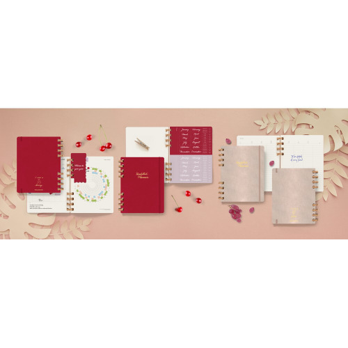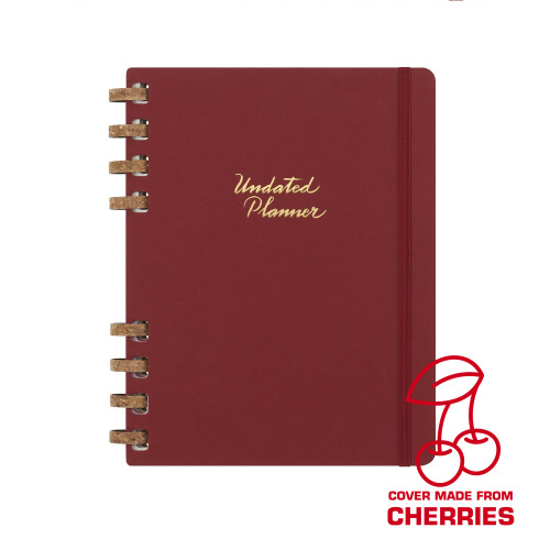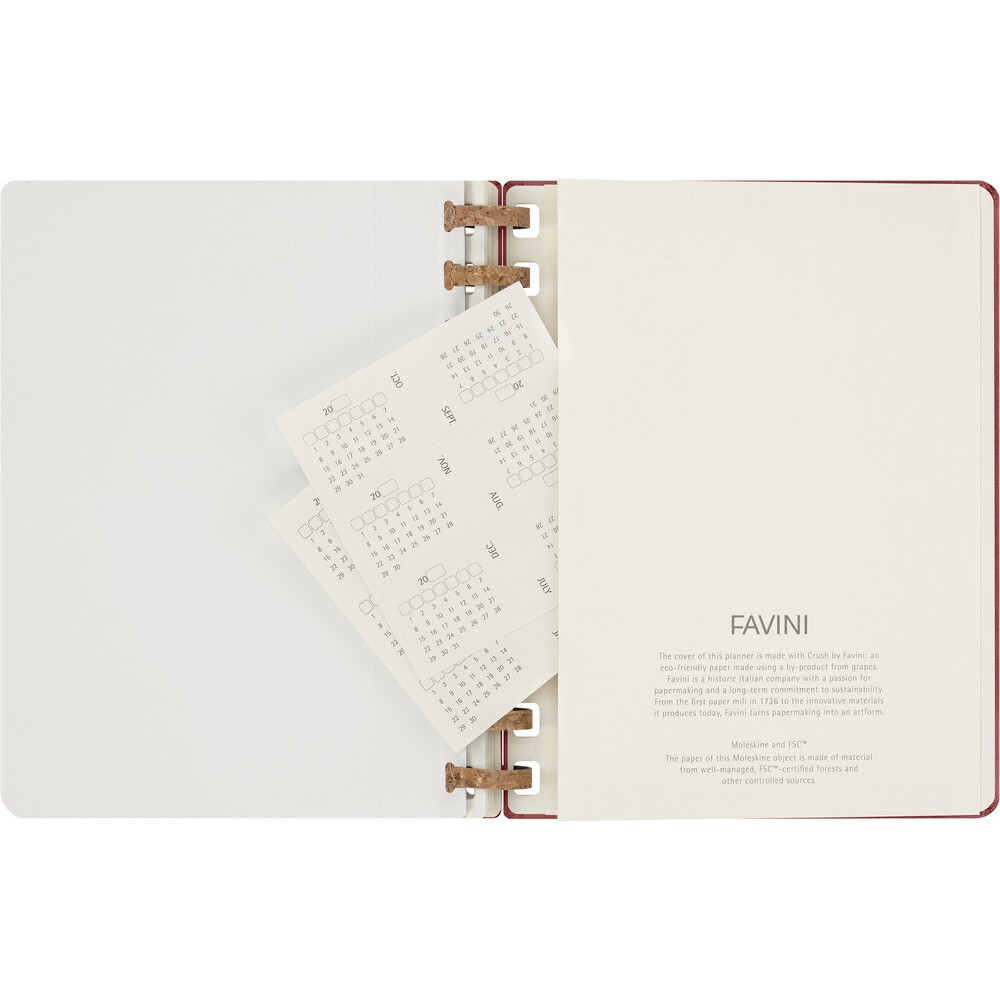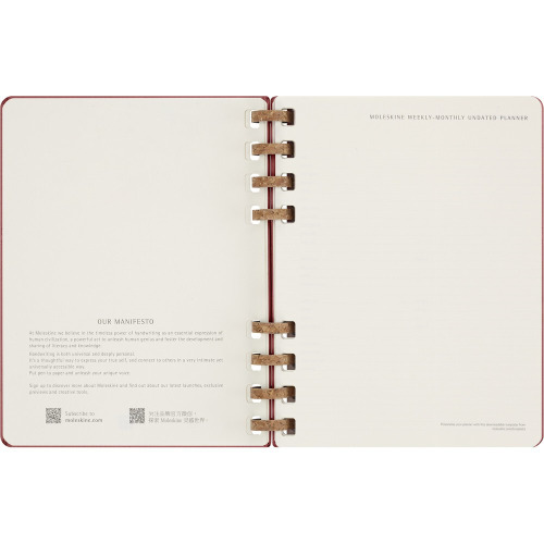 Spiralny kalendarz XL (ok. B5) MOLESKINE Undated Life, 12 konfigurowalnych przegródek na miesiące, 5 niedatowanych tygodni na miesiąc (każdy tydzień przedstawiony na dwóch stronach), przegląd roczny (4 datowane lata), 2 laminowane zakładki, twarda okładka wykonana z papieru wyprodukowanego z przetworzonych pozostałości owoców (-05: wiśni, -21: winogron), układ miesięczny oraz tygodniowy-horyzontalny (200 str.), elastyczna opaska do zamykania