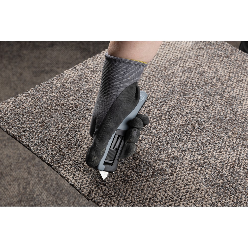 Nóż do tapet, ostrze chowa się automatycznie, wykonany z ABS, PC i stali nierdzewnej pochodzących z recyklingu z certyfikatem RCS, całkowita zawartość materiałów z recyklingu obliczona na podstawie wagi przedmiotu: 93%, w pudełku papieru kraftowego z certyfikatem FSC® mix