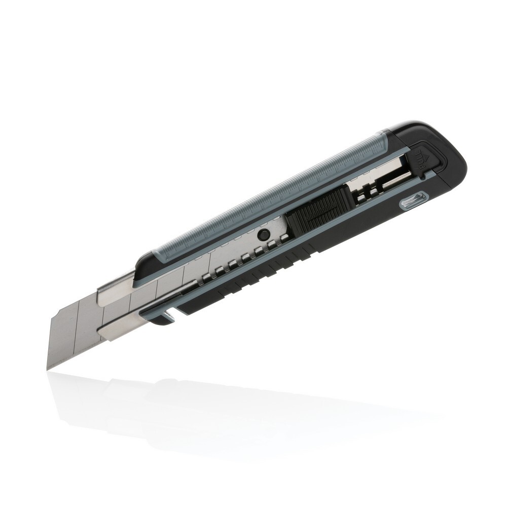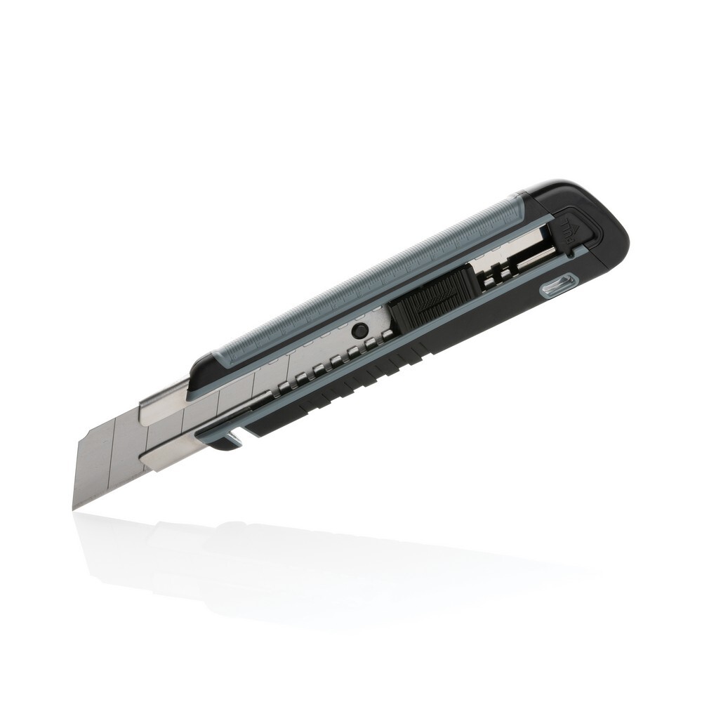 Nóż do tapet, wymienne ostrza, wykonany z ABS z recyklingu z certyfikatem RCS, łamane ostrze ze stali nierdzewnej, całkowita zawartość materiałów z recyklingu obliczona na podstawie wagi przedmiotu: 41%, produkt jest dostarczany z 1 ostrzem wewnątrz noża oraz 2 ostrzami zapasowymi, w pudełku papieru kraftowego z certyfikatem FSC® mix
