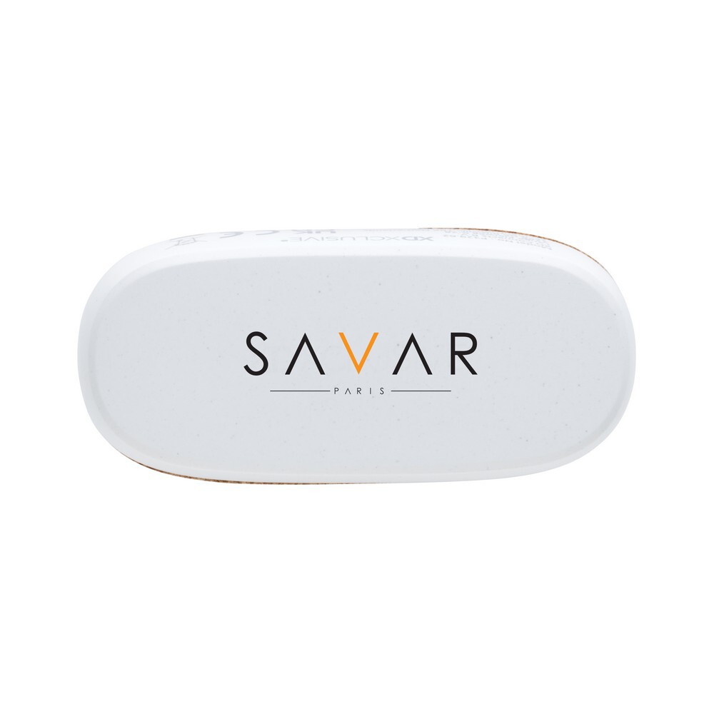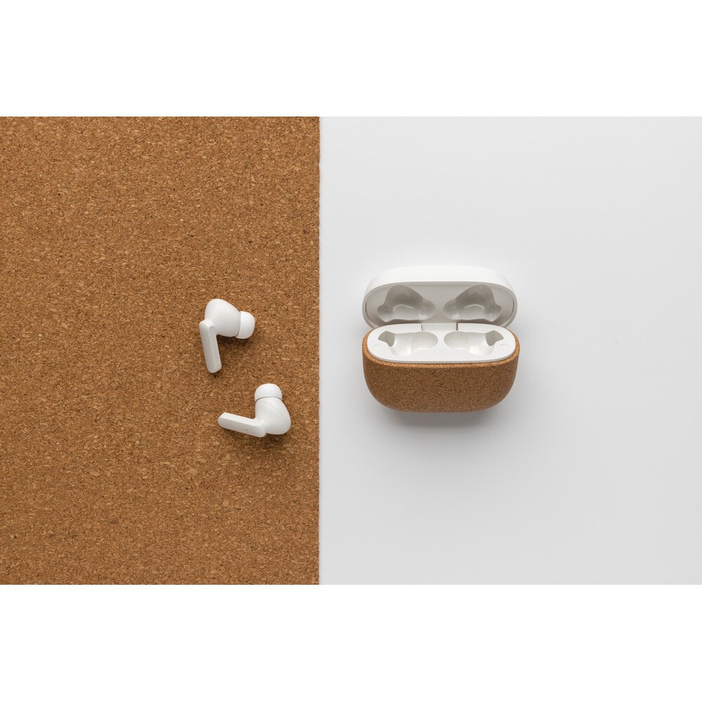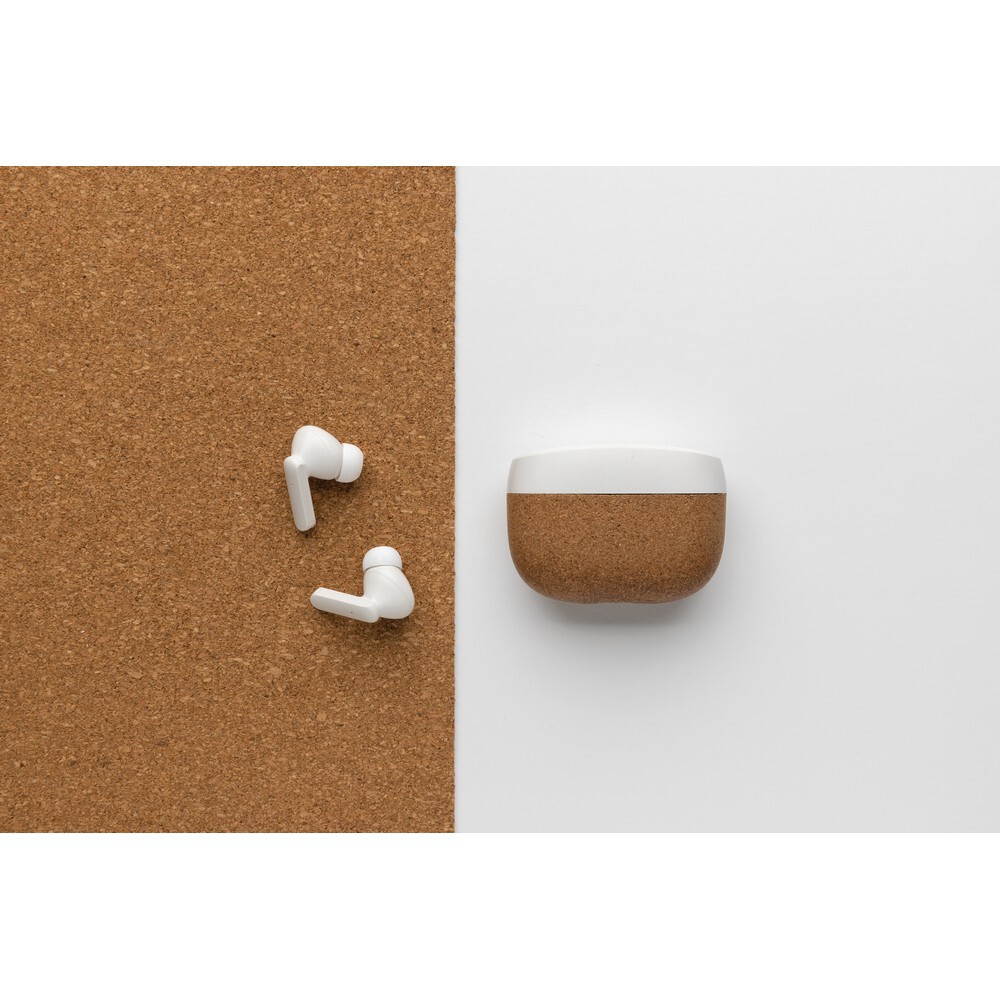 Douszne słuchawki bezprzewodowe TWS BT5.3, wbudowany mikrofon, funkcja odbierania połączeń, funkcja automatycznego parowania, czas odtwarzania na średnim poziomie głośności do 3 godzin, ponowne ładowanie w etui ładującym w ciągu 1,5 godziny, zasięg do 10 m, silikonowe wkładki o 3 różnych rozmiarach w komplecie, wykonane z korka z certyfikatem FSC® oraz ABS z recyklingu z certyfikatem RCS, całkowita zawartość materiałów z recyklingu obliczona na podstawie wagi całkowitej przedmiotu: 35%, kabel z TPE z recyklingu z certyfikatem RCS w komplecie, w pudełku z papieru kraftowego z certyfikatem FSC® mix