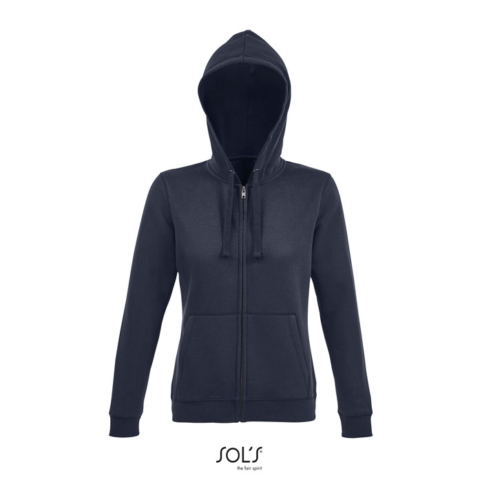 SOL'S SPIKE WOMEN. Damska bluza z kapturem na zamek błyskawiczny, 80% bawełna ring spun. Szczotkowana bawełna wewnątrz, na zewnątrz: 100% bawełna FLEECE 280 LSF (Low Shrinkage Fabric), dopasowane rękawy, 2 przednie kieszenie, podszyty kaptur ze sznurkiem ściągającym w kolorze, 2x2 prążkowane mankiety i obszycie. Wewnętrzny kołnierz półksiężycowy, zamek błyskawiczny YKK. OEKO-TEX®. Sprzedawana tylko z nadrukiem.