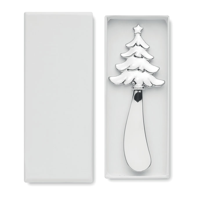 Nóż do sera ze stopu cynku w kształcie choinki. Prezentowany w pudełku upominkowym.