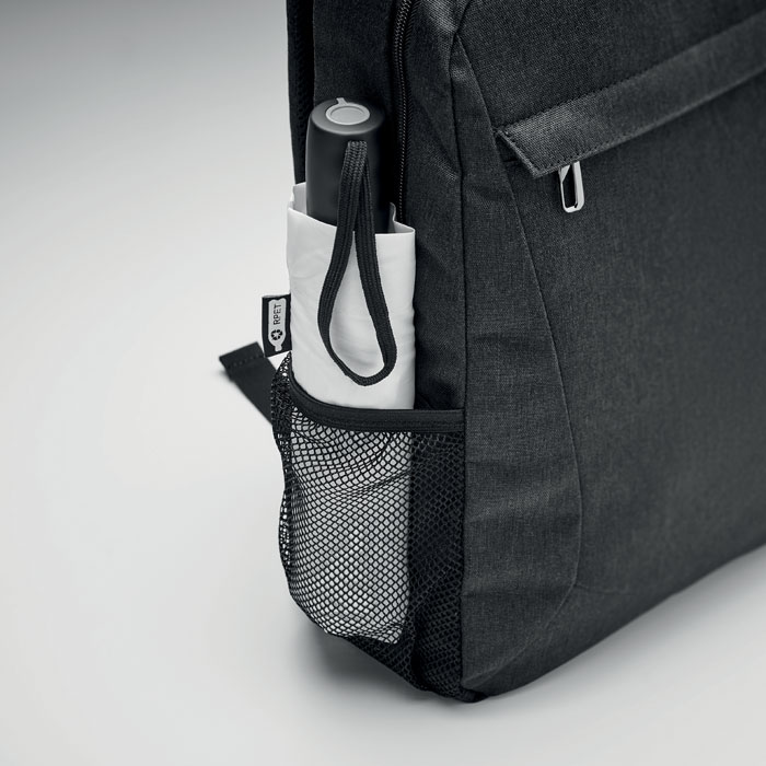Plecak na laptopa 15 cali z poliestru 600D RPET. Wewnętrzna przegroda na laptopa i kilka małych wewnętrznych przegródek. Posiada przednią kieszeń na zamek błyskawiczny i 2 boczne kieszenie z siateczki. Regulowane szelki. Uchwyt na walizkę z tyłu.