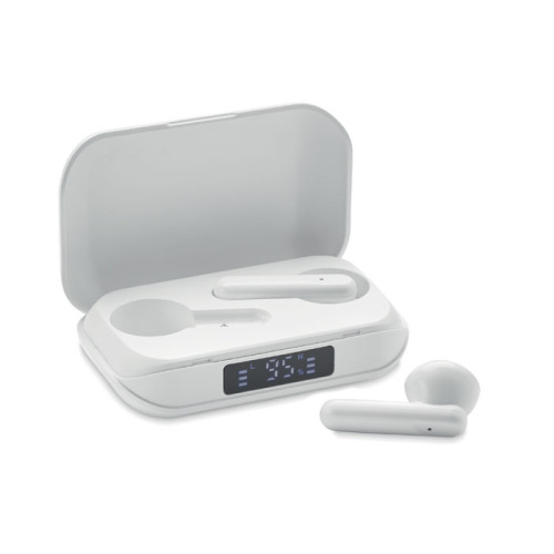 Bezprzewodowe, stereofoniczne słuchawki douszne z ABS z recyklingu True Wireless Stereo (TWS) 5.3 z mikrofonem i wbudowanym akumulatorem 25 mAh. czas odtwarzania ok. 3 godziny. Posiada wyświetlacz LCD poziomu naładowania. Automatyczne parowanie. W zestawie kabel do ładowania typu C oraz stacja ładująca o pojemności 250 mAh.