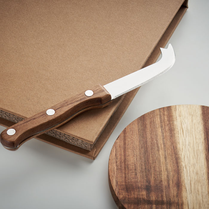 Mała deska do serów z drewna akacjowego z nożem ze stali nierdzewnej. Prezentowana w kartonowym pudełku upominkowym. Drewno jest produktem naturalnym, dlatego mogą wystąpić nieznaczne różnice w kolorze, wzorze i rozmiarze.