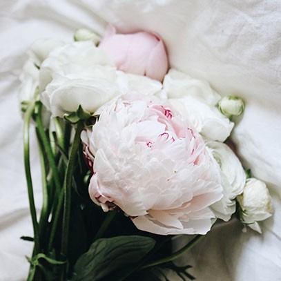nuty serca: kwiaty piwoni, lilii i świeżo ściętych frezji,