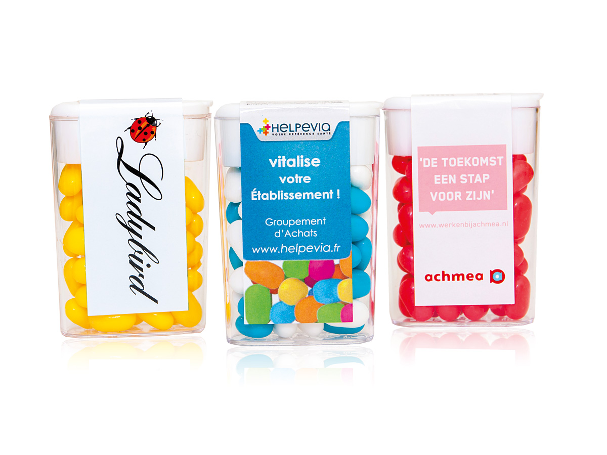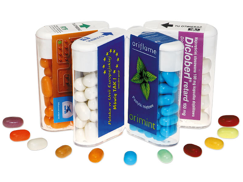 Drażetki w plastikowym pudełku oklejone z obu stron samoprzylepną etykietą reklamową zaprojektowaną przez Ciebie.